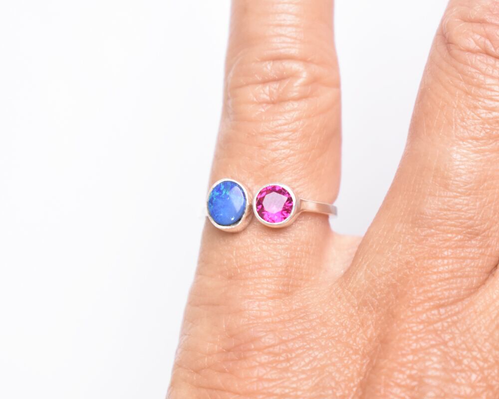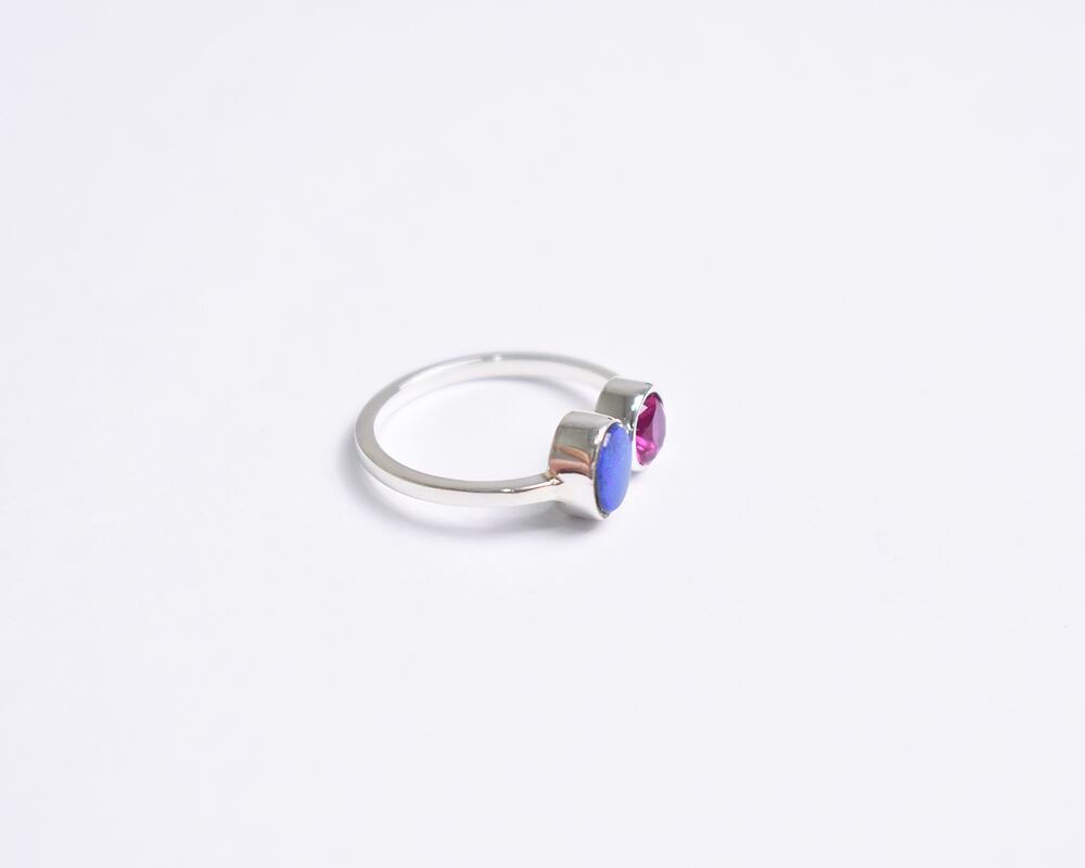 エレガントな輝きを放つ、オパールとルビーのダブルストーンシルバーリング。