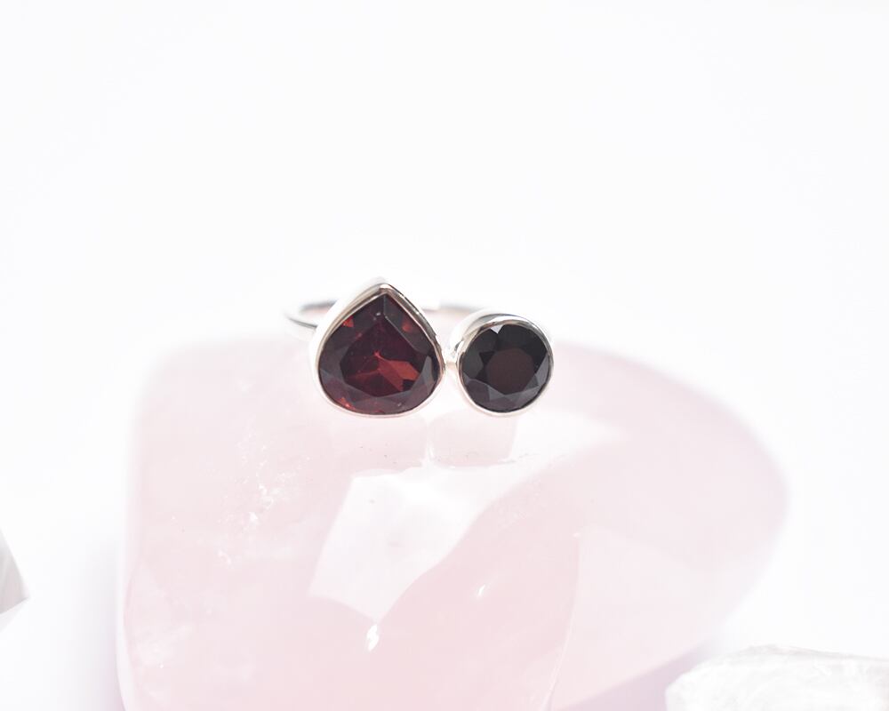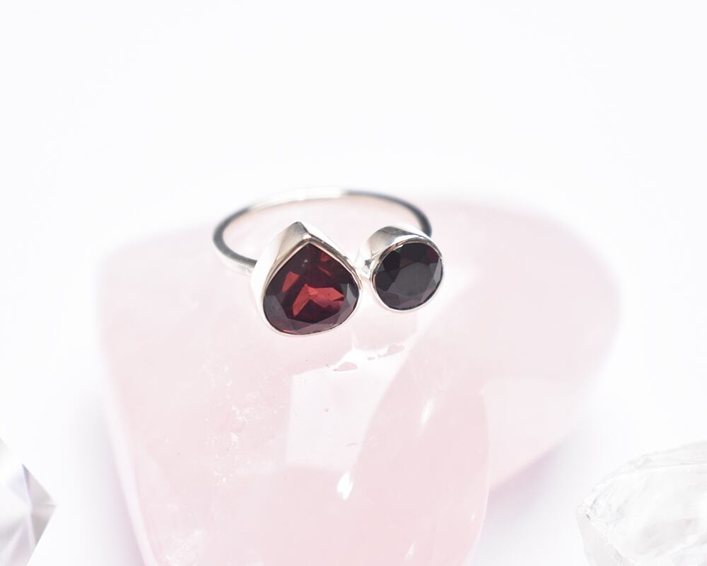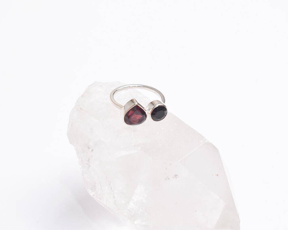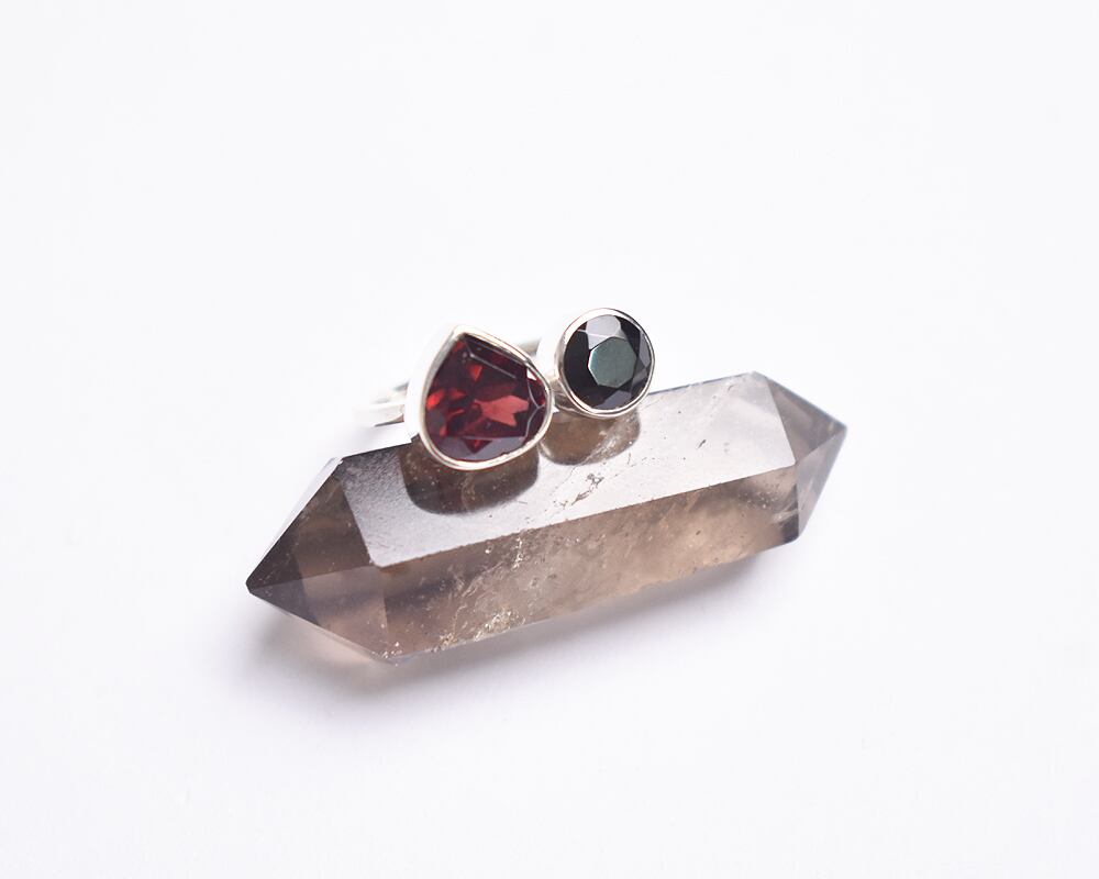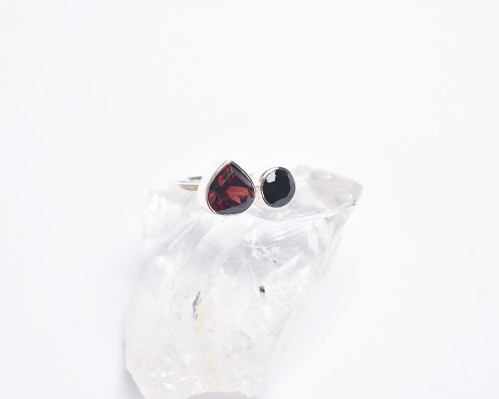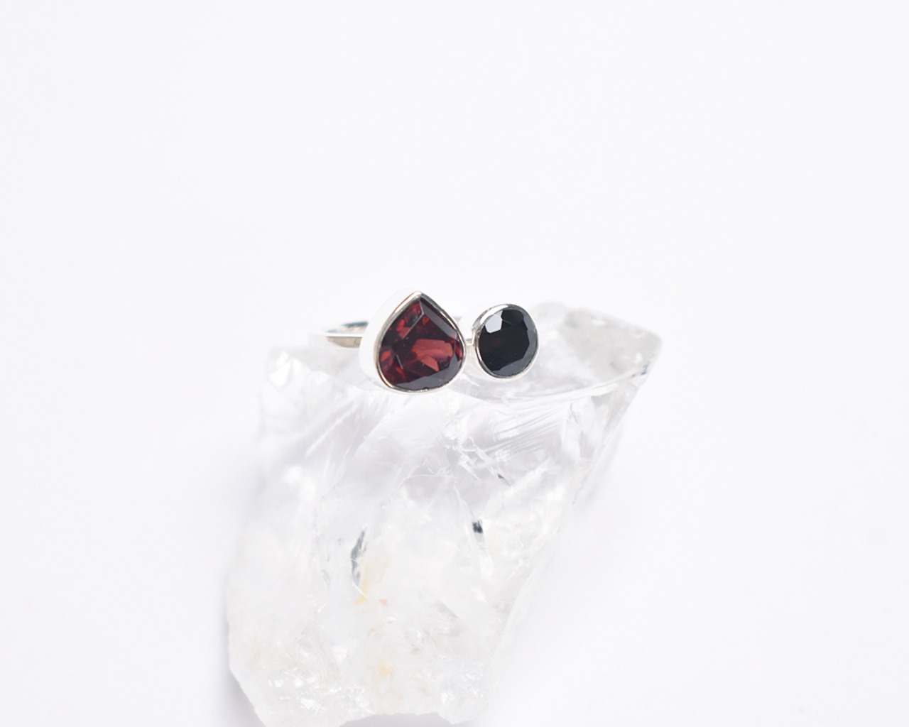 丸みを帯びたマロンカットのガーネットと漆黒の輝きを放つ天然石ブラックスピネルのシルバーリング。