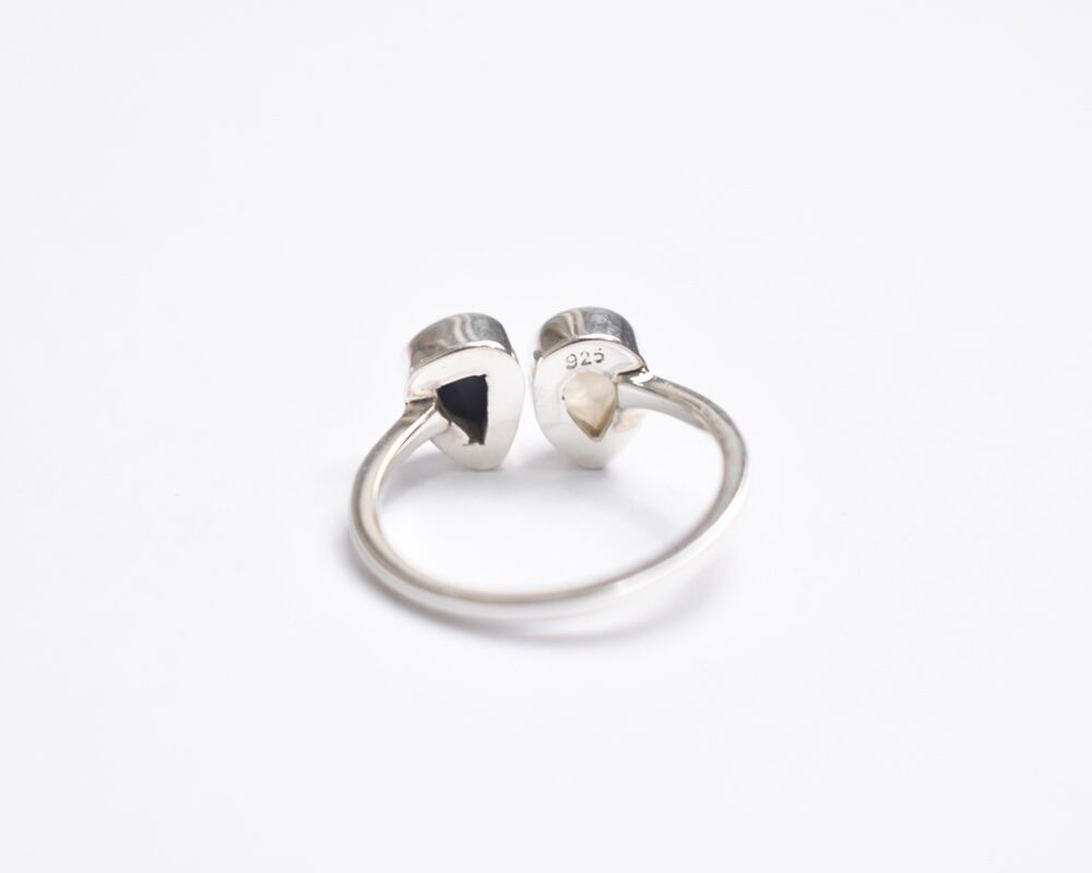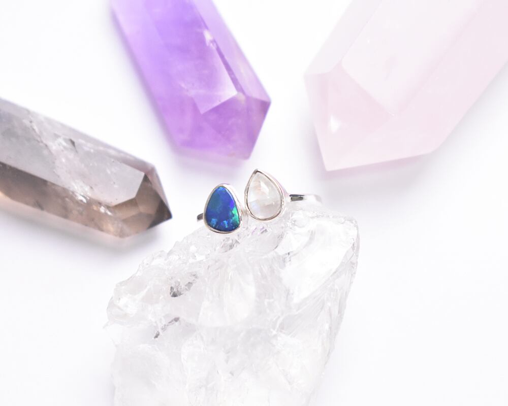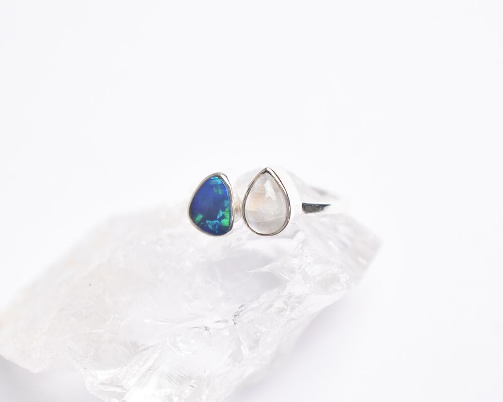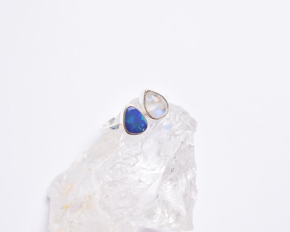 深海の神秘を閉じ込めたような濃い青のオパールと、ドロップ型のレインボームーンストーンが織りなす、幻想的なフォークリングです。
