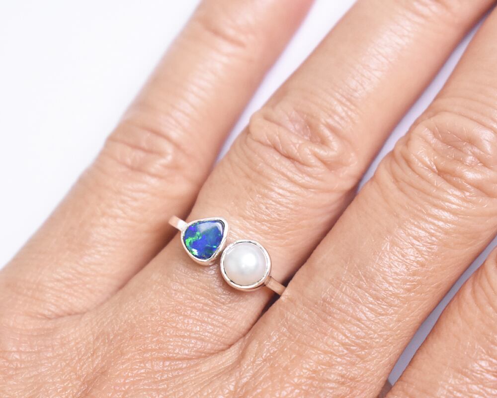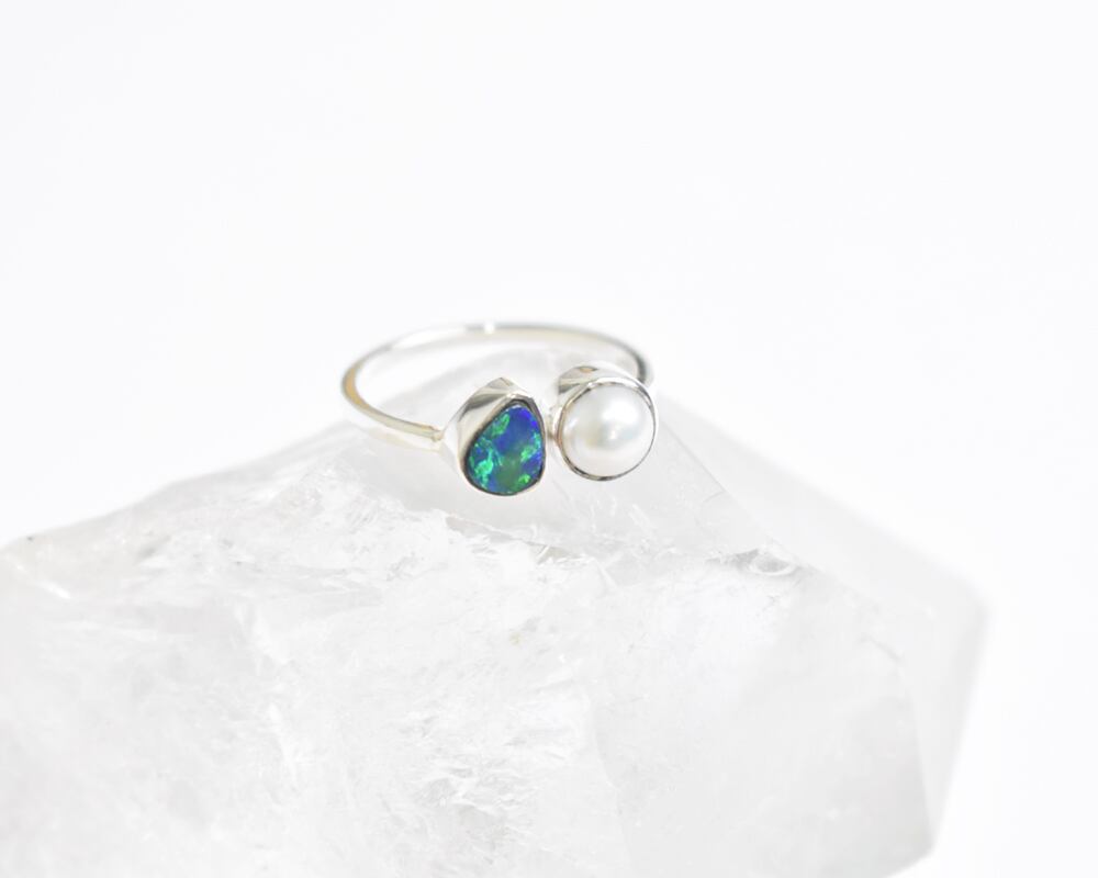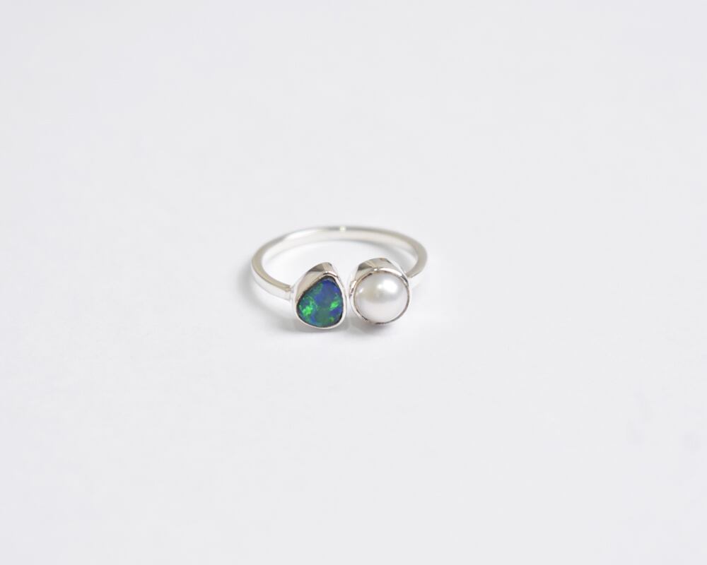 オパールの華やかな輝きを、丸い淡水パールが優しく包み込みます。