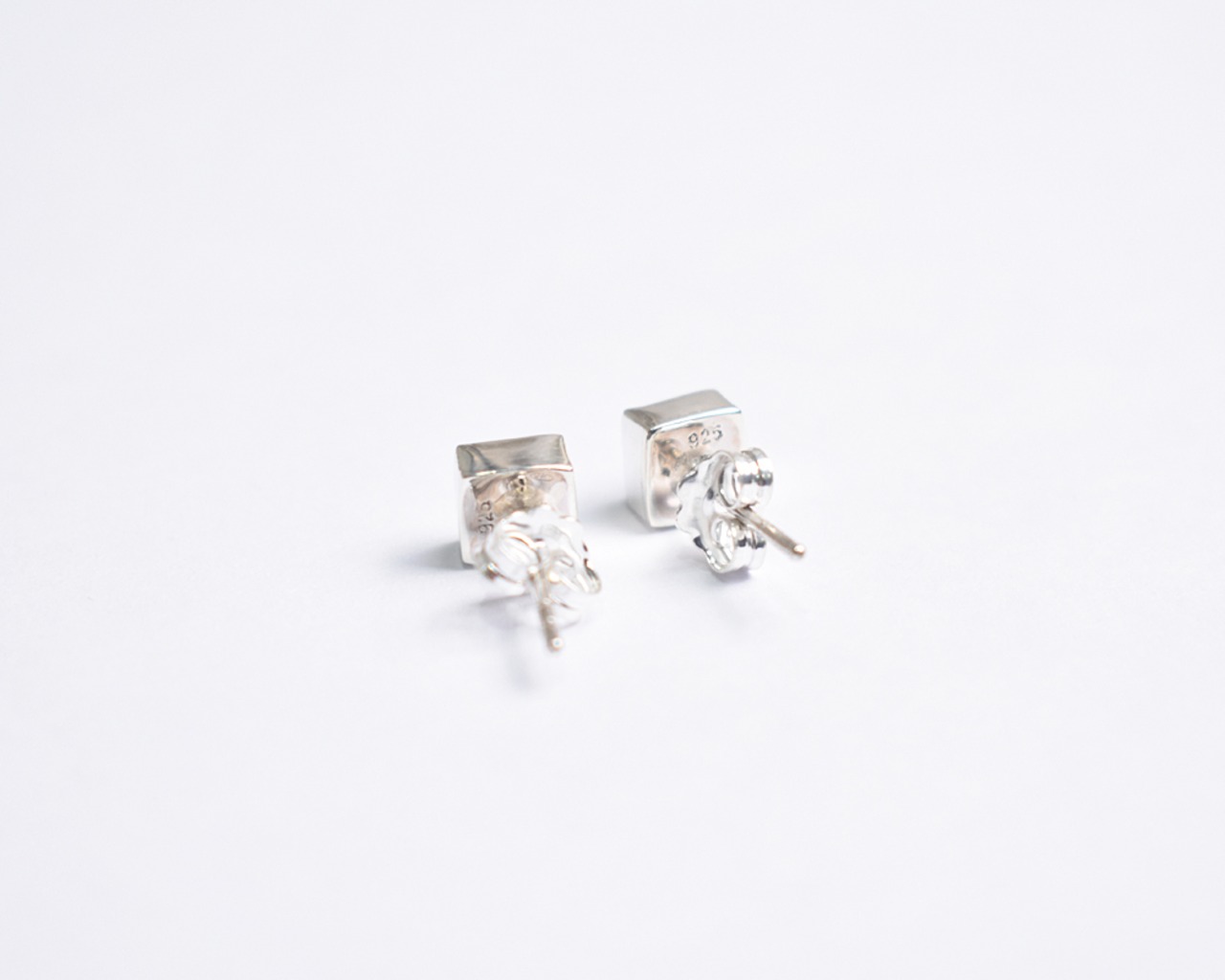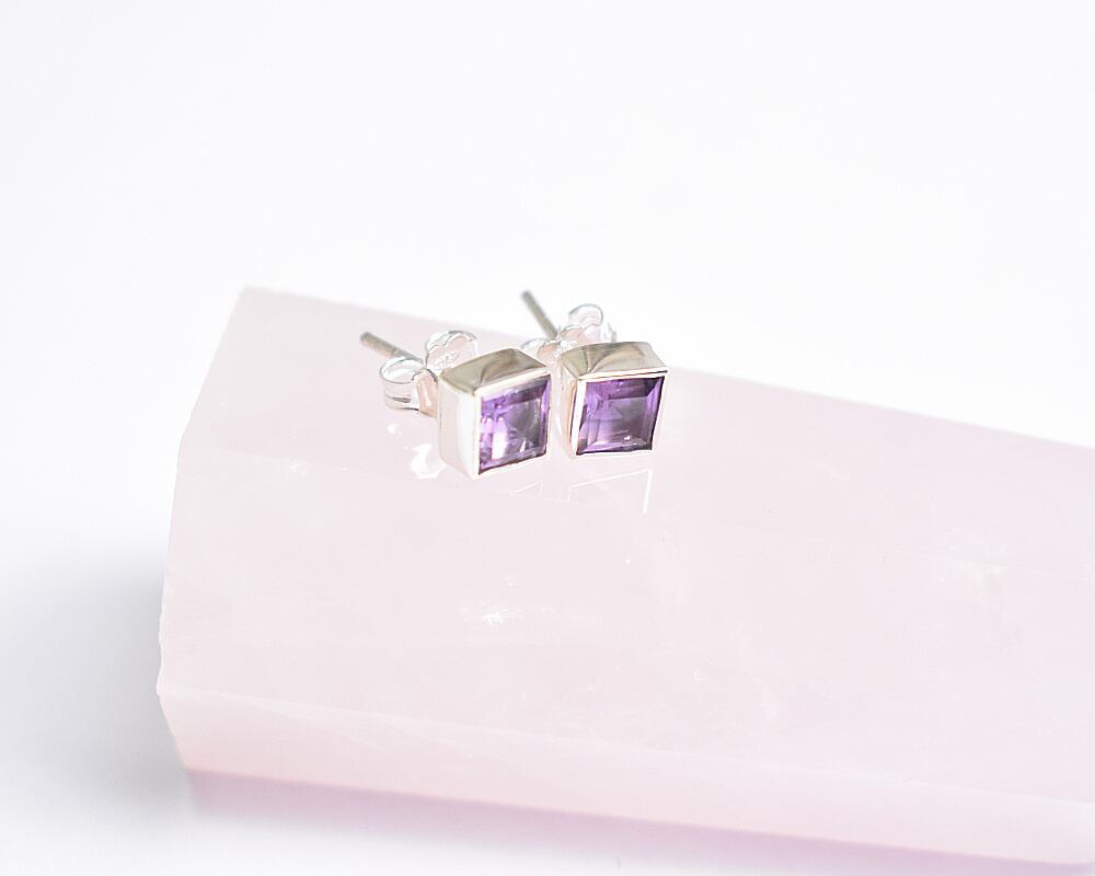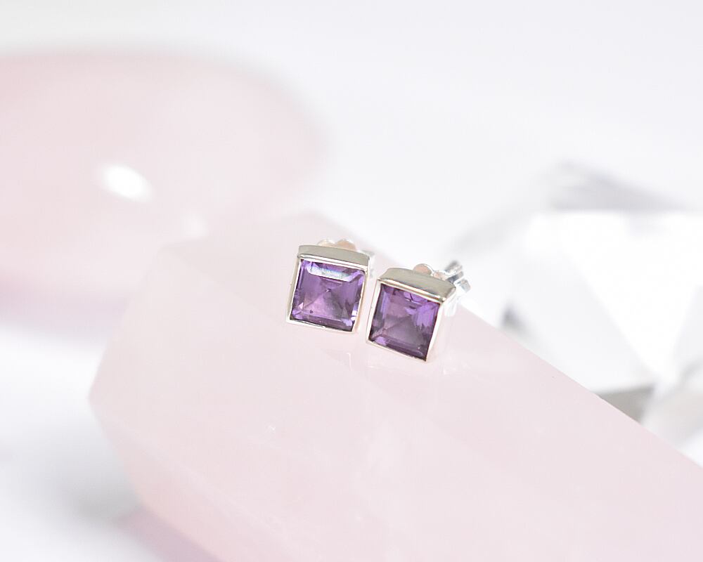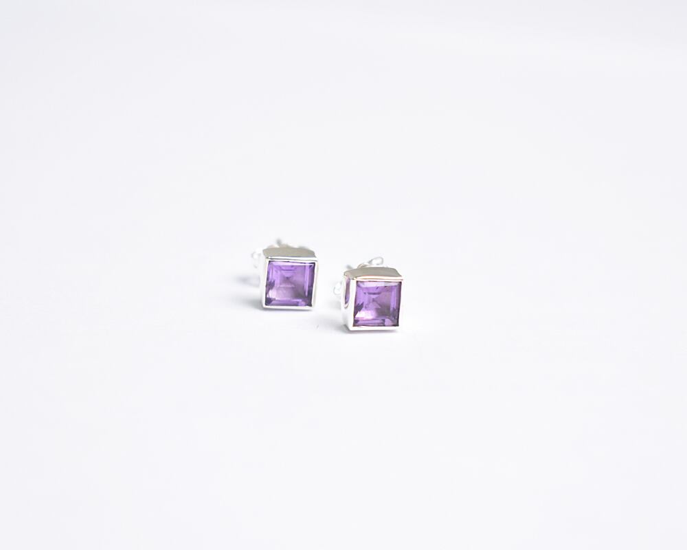 深く上品な紫色のアメジストを使用した、スクエア型のスタッドピアス。