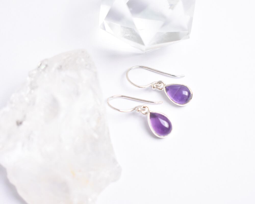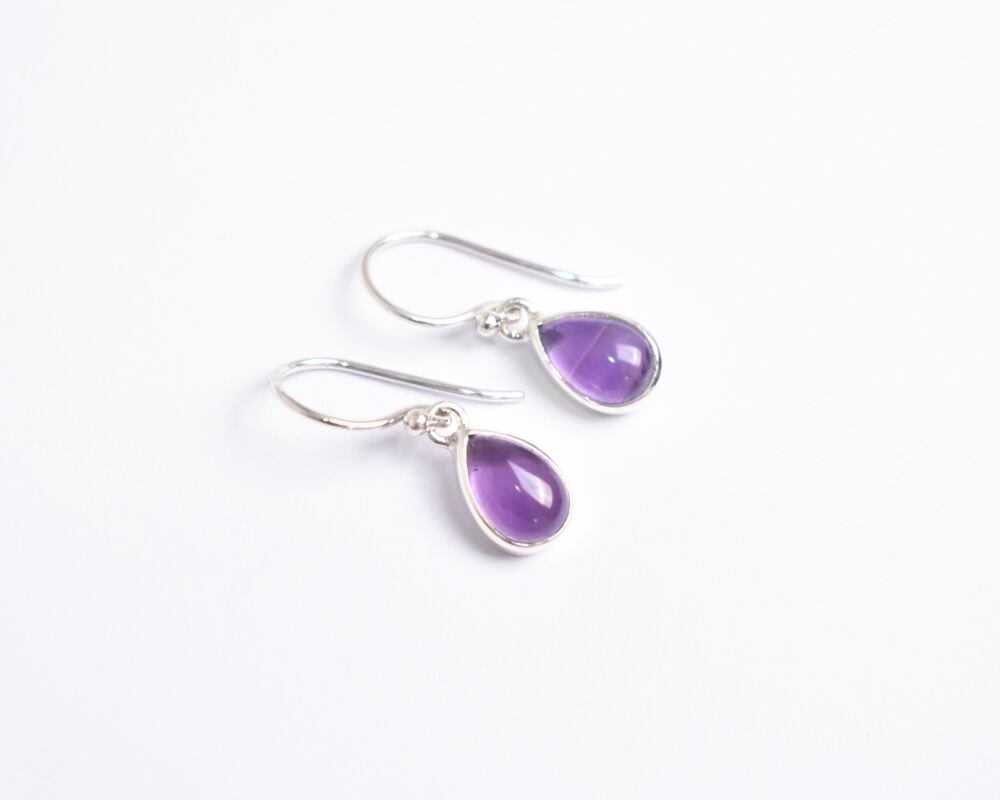つるんとした質感が愛らしい、カボションカットのアメジストを使用した、しずく型のフックピアス。