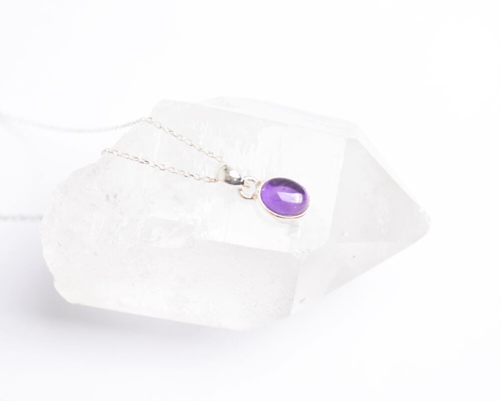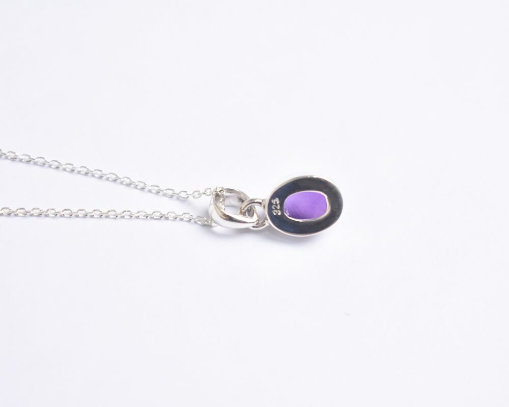 深みのある紫色が美しい、カボションカットのアメジストをあしらった一粒ネックレス。