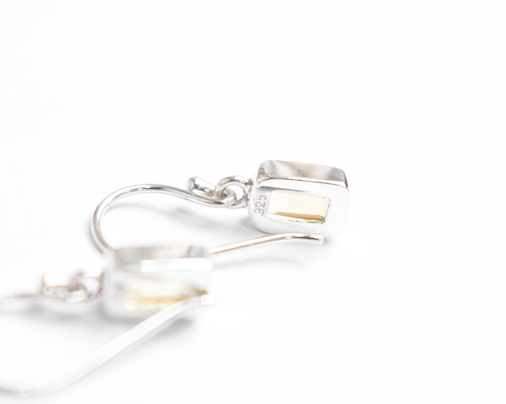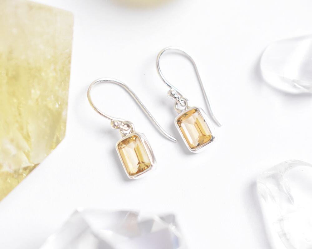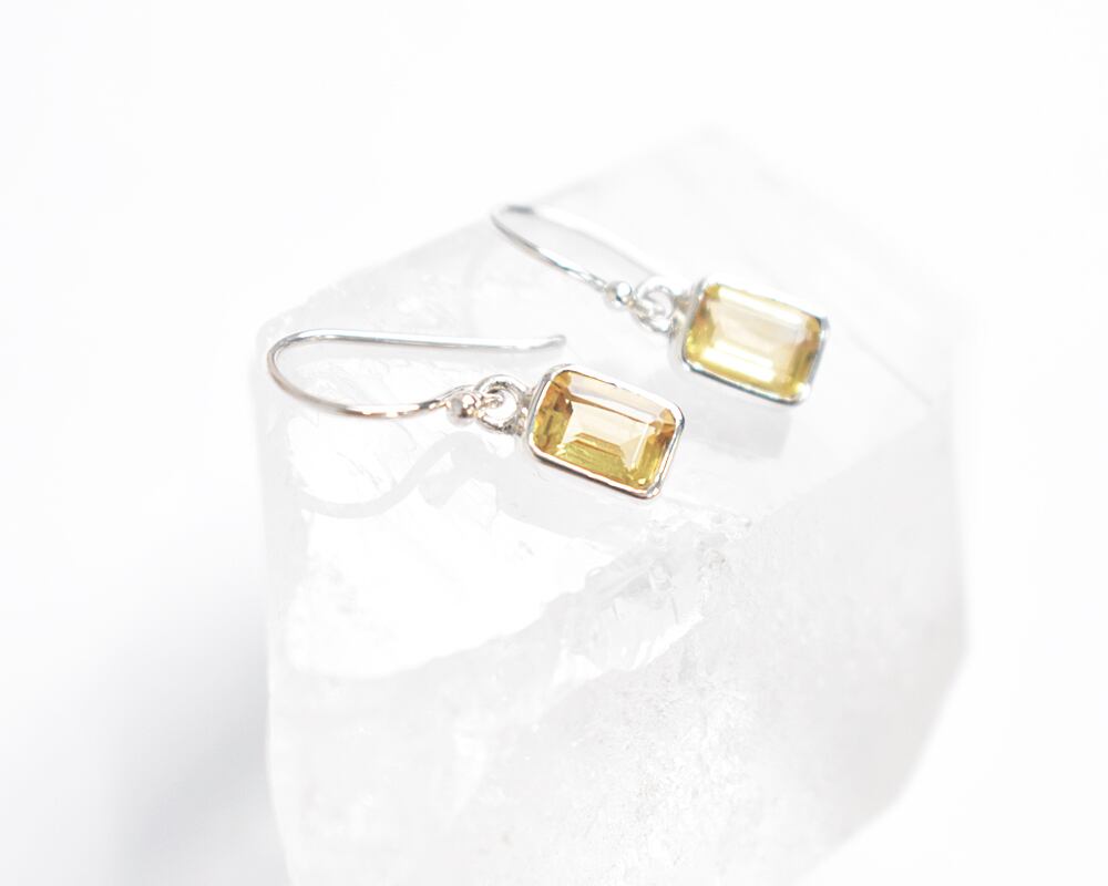 長方形(レクタングル)に丁寧にカットされた天然シトリンは、透明感と輝きが際立ち、耳元で揺れるたびにキラキラと美しい表情を見せてくれます。