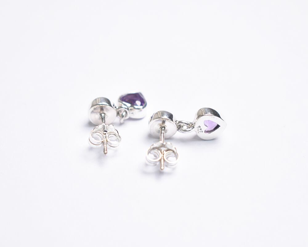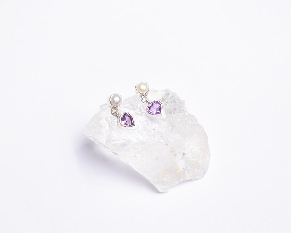 ハート型にカットされた濃い紫色のアメジストと、ふんわり優しい輝きをもつ淡水パールを合わせた、小さなスタッドピアス。