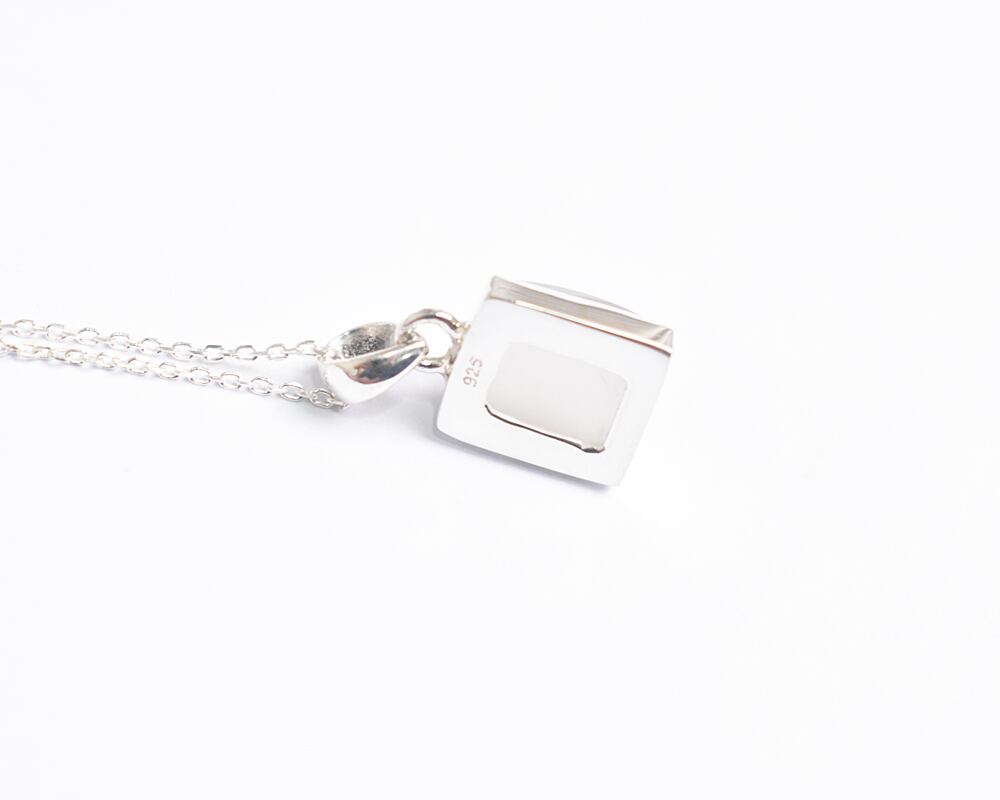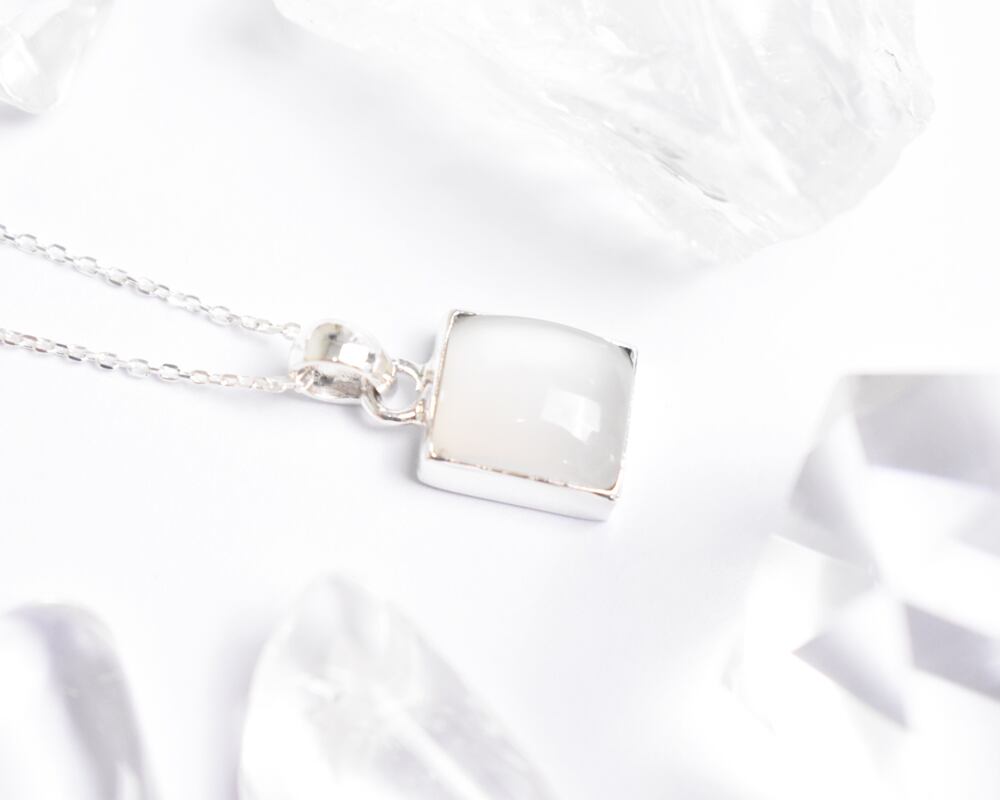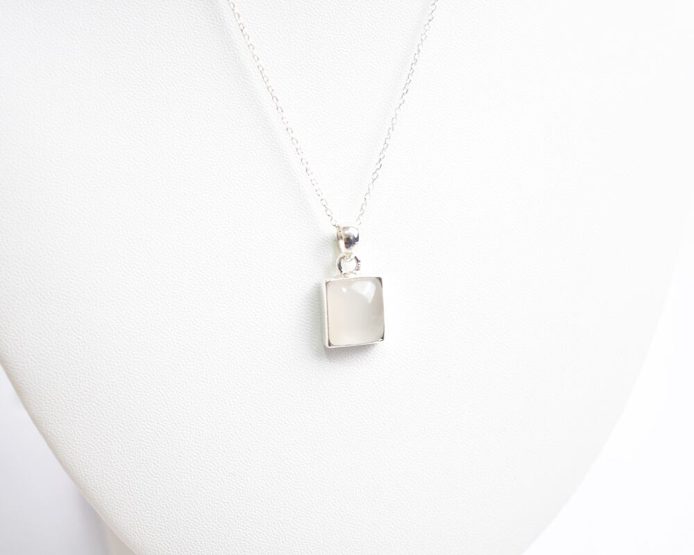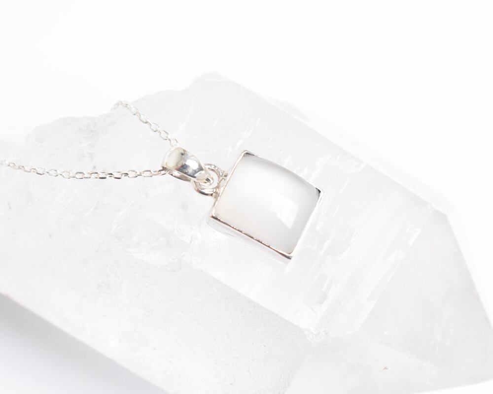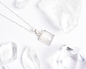 長方形のムーンストーンが胸もとで静かに光を返し、どんな装いにもすっとなじむ上品なデザイン。