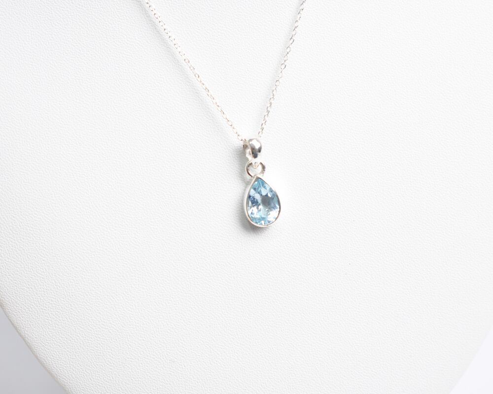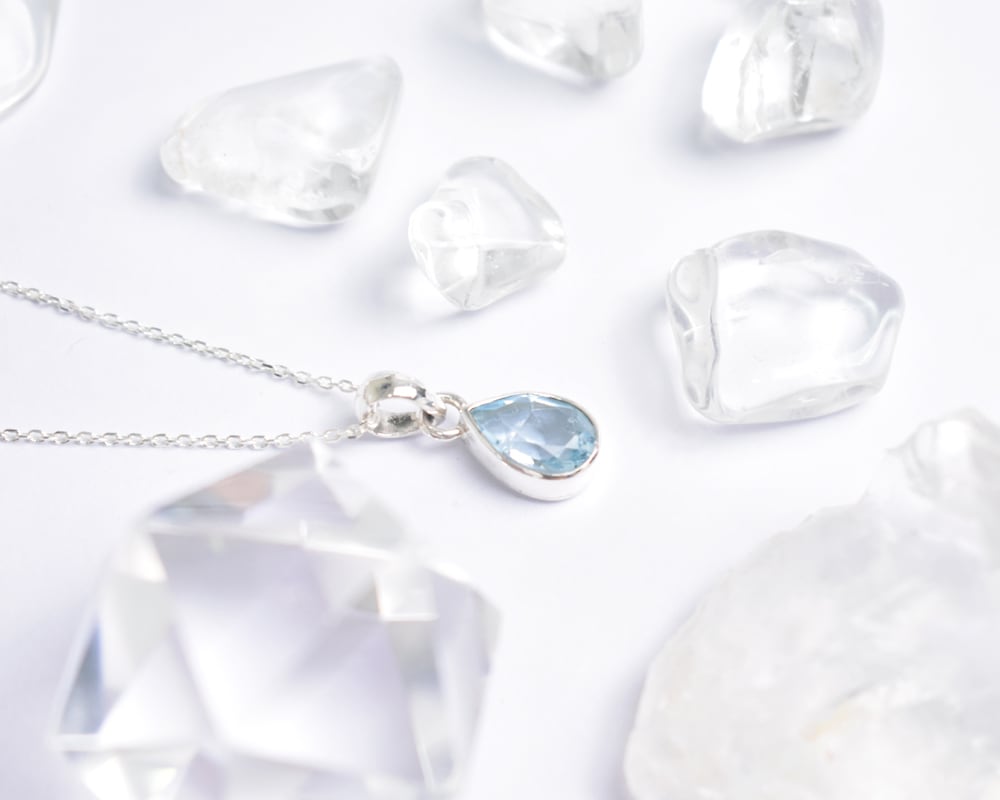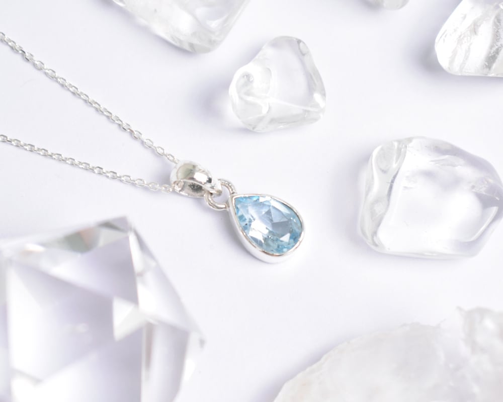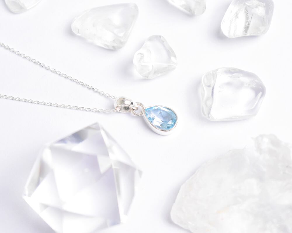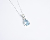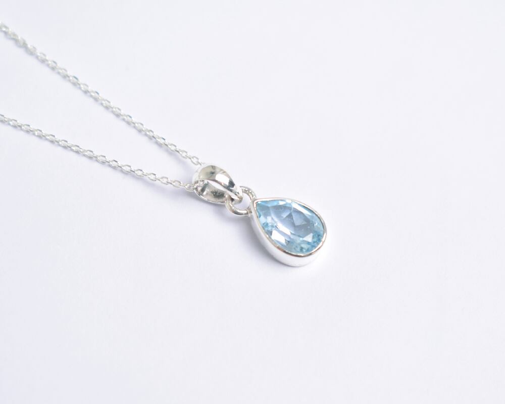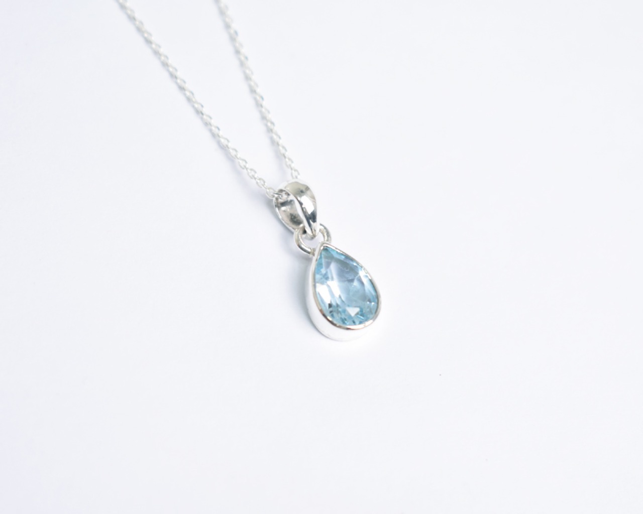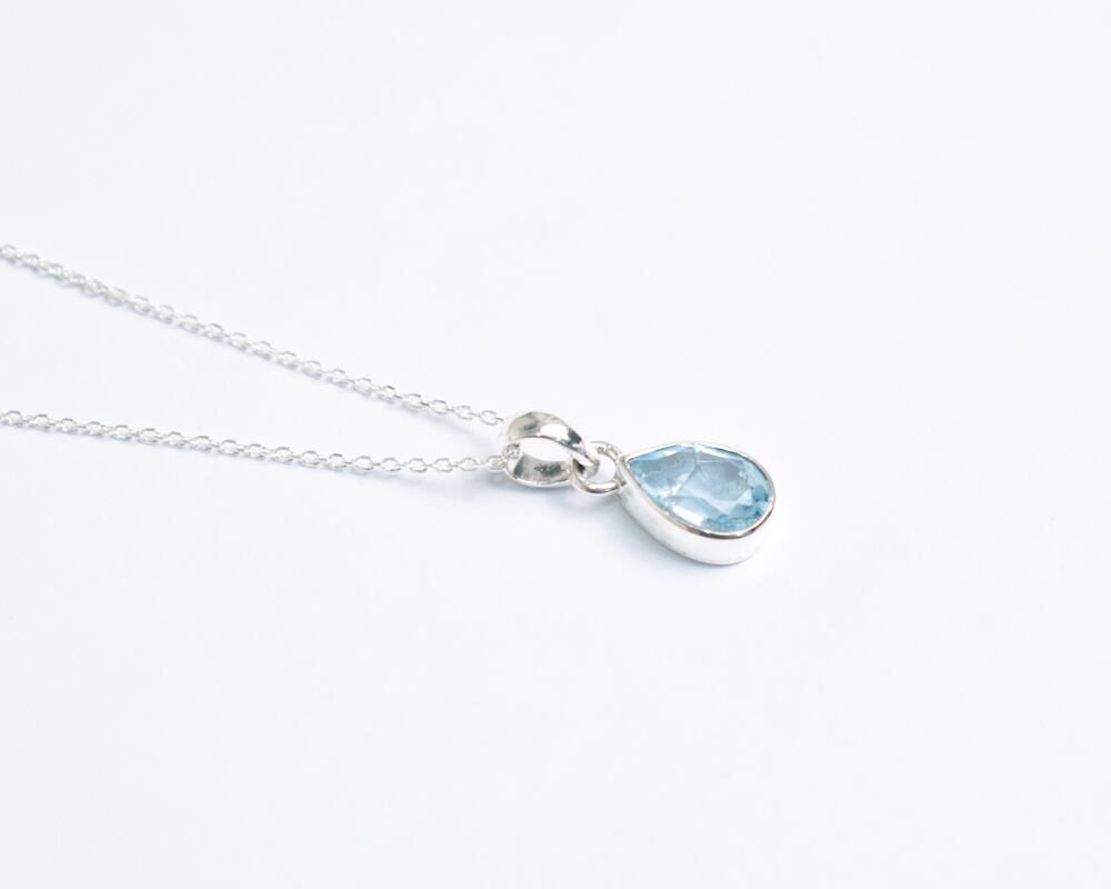 まるで光をまとった水のしずくを、そのままジュエリーにしたようなしずく型ブルートパーズのシルバーネックレス。