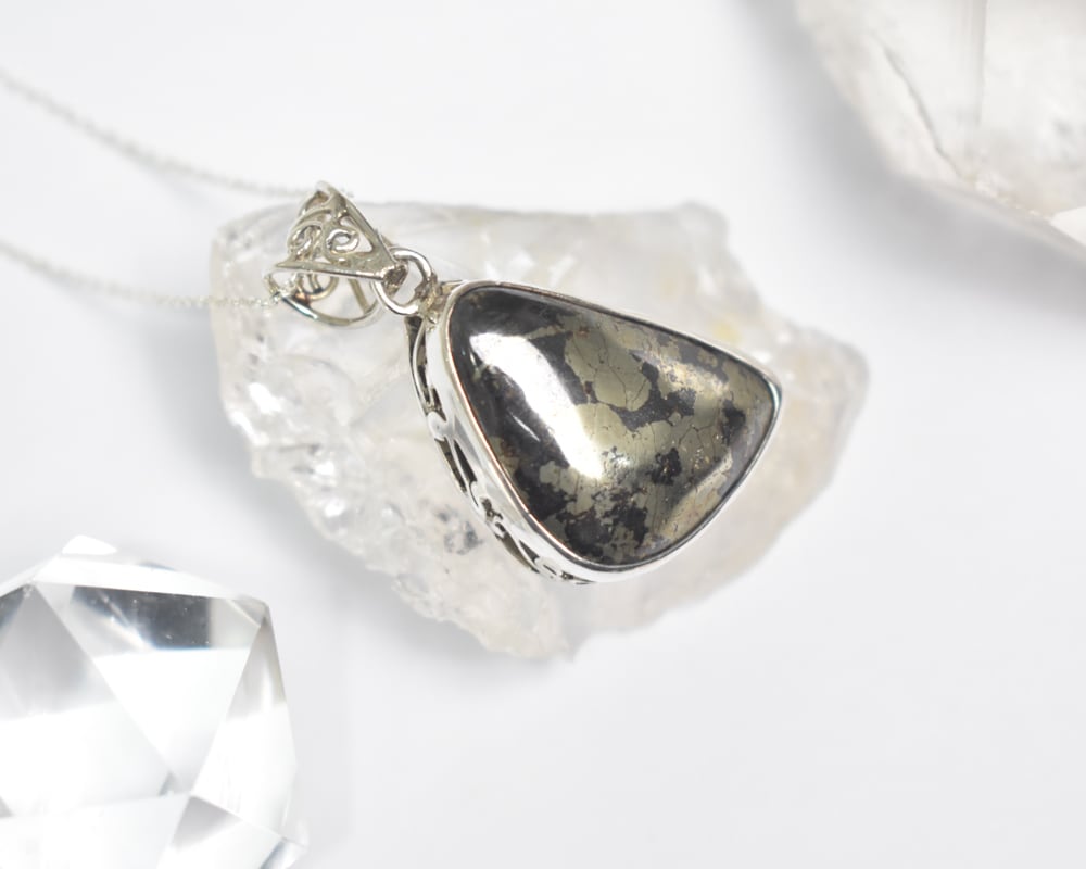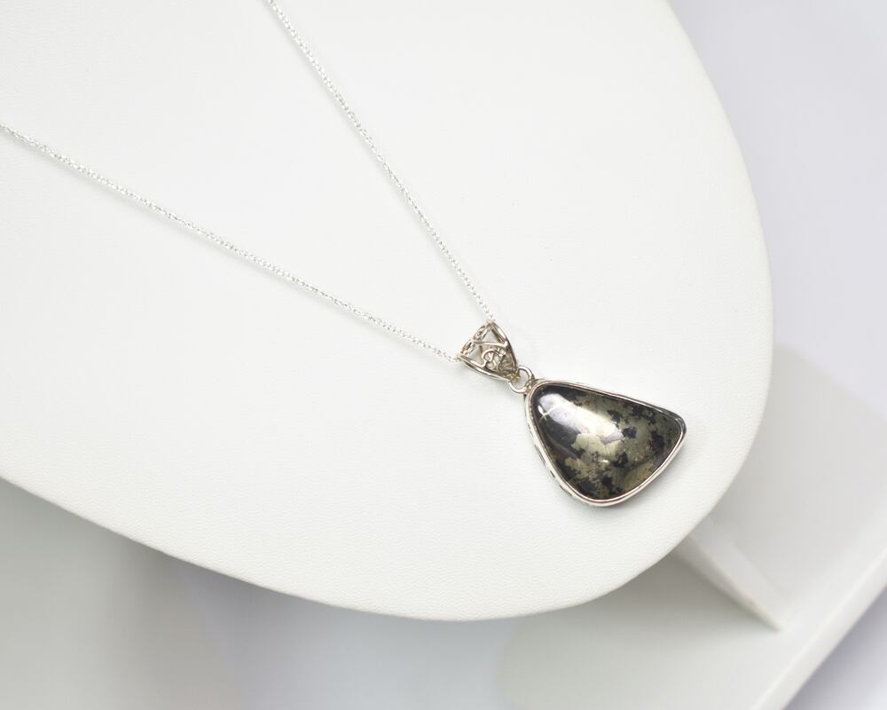 金色のイメージがあるパイライトですが、こちらは黒みを帯びた、落ち着いた表情が印象的な石です。