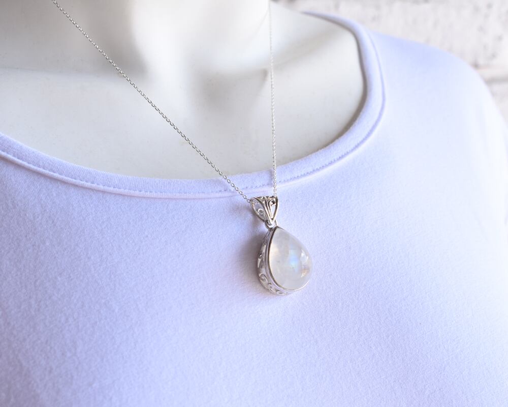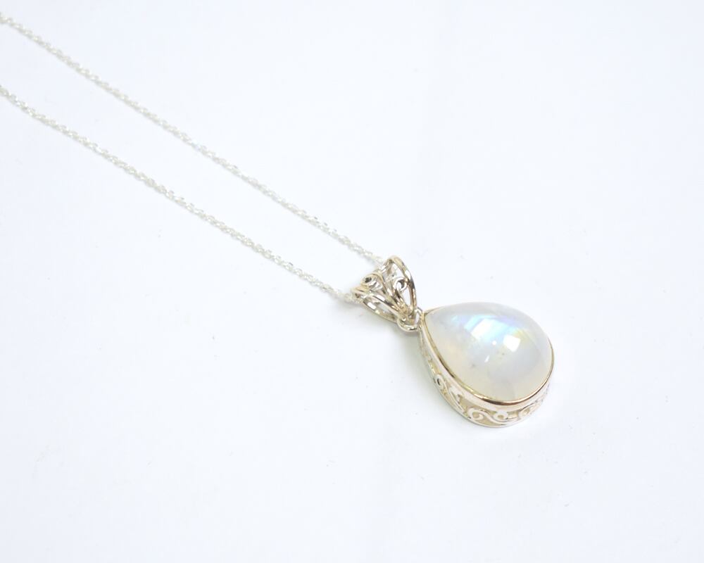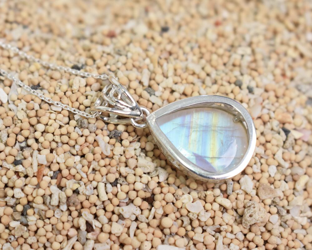 神秘的なブルーシラーに加え、角度によって虹色の光も浮かび上がる、幻想的なレインボームーンストーンを贅沢にあしらったネックレスです。