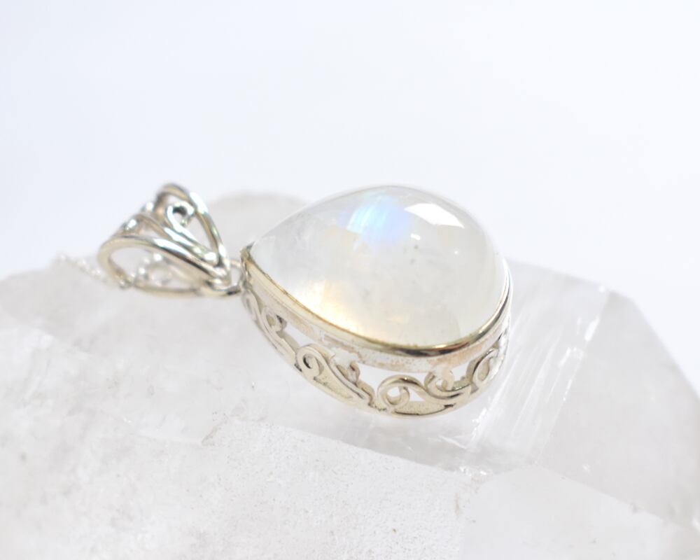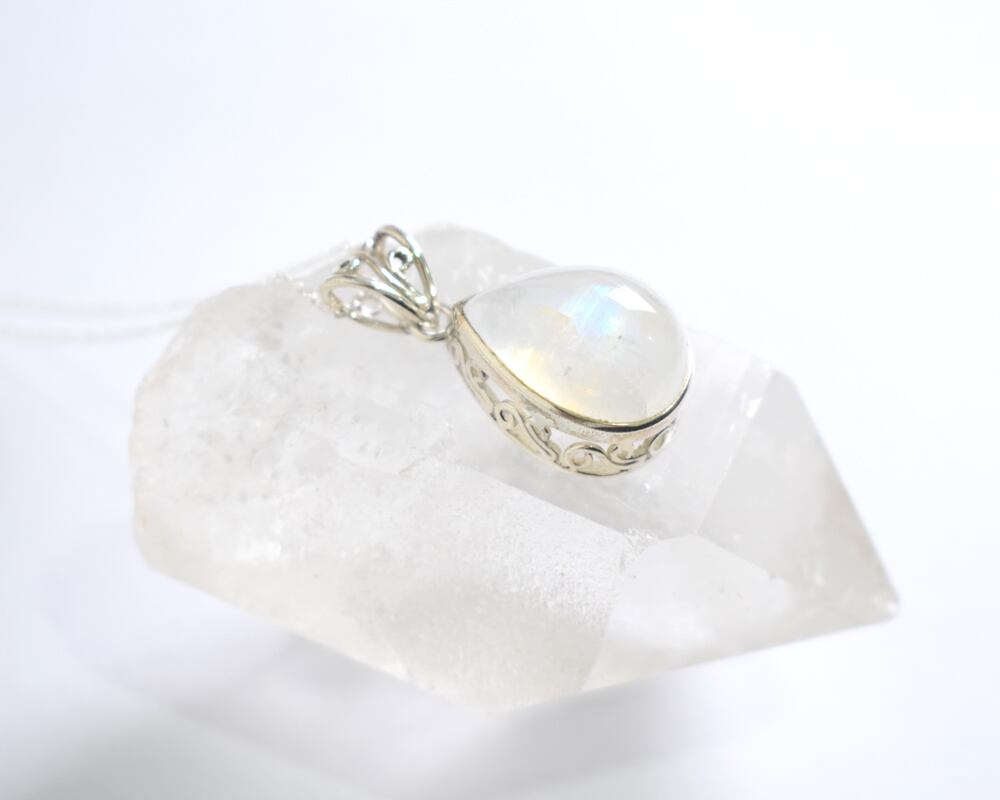 光を受けるたびに煌めくブルーと虹色の輝きは、つい見とれてしまうほど美しく、まるで月と虹の光を閉じ込めたかのような神秘的な表情を見せてくれます。