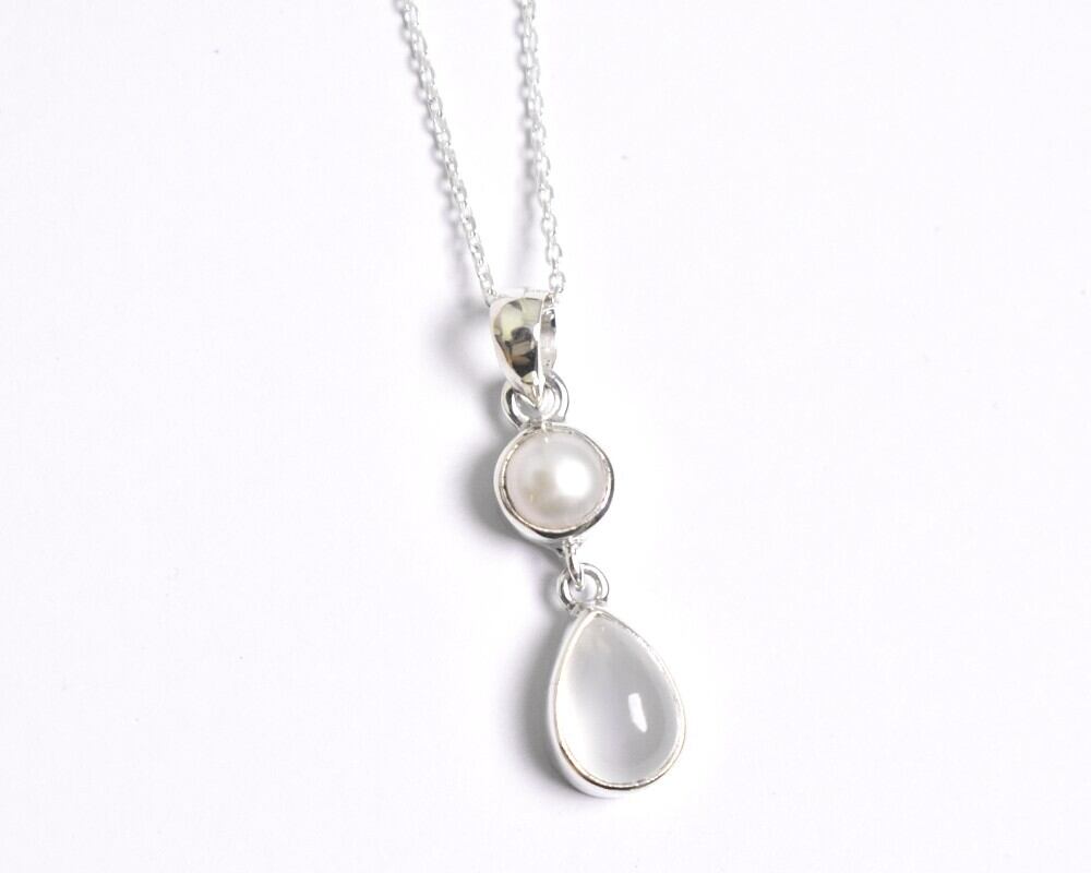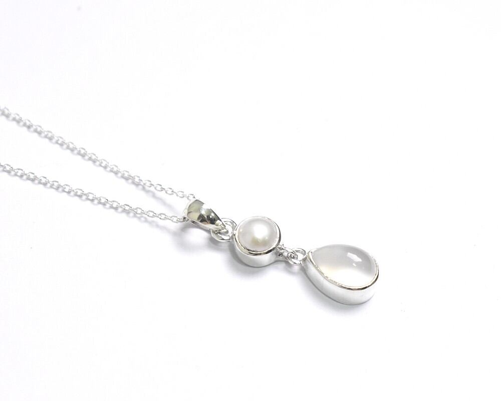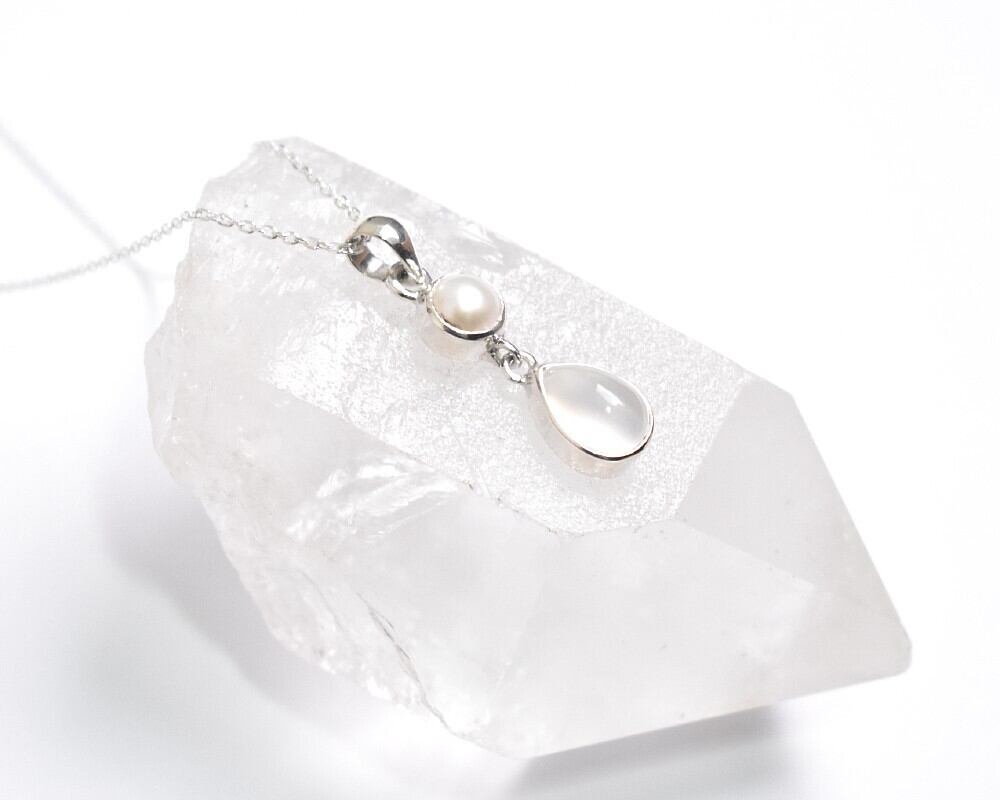 月の光を閉じ込めたような、神秘的な輝きを放つムーンストーンと、優しい光沢を放つ淡水パールのシルバー925ネックレス。