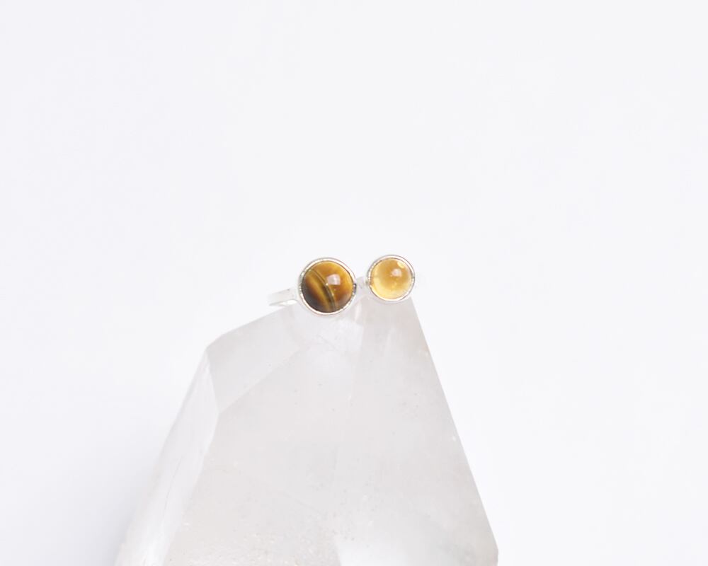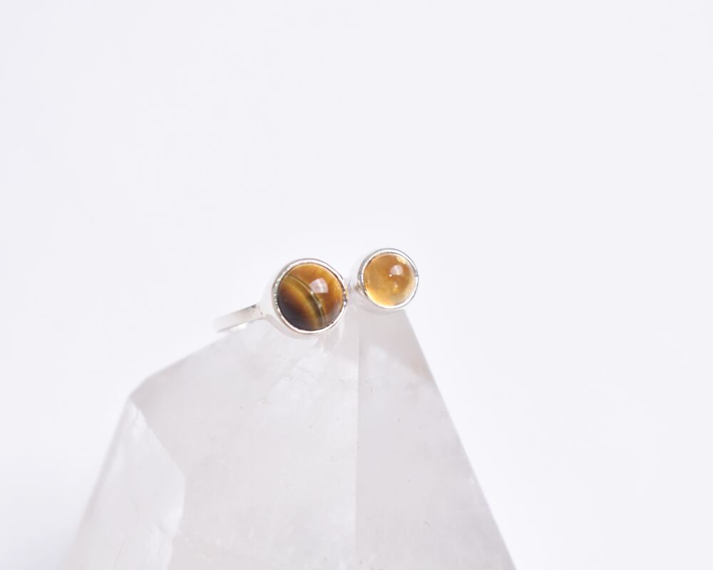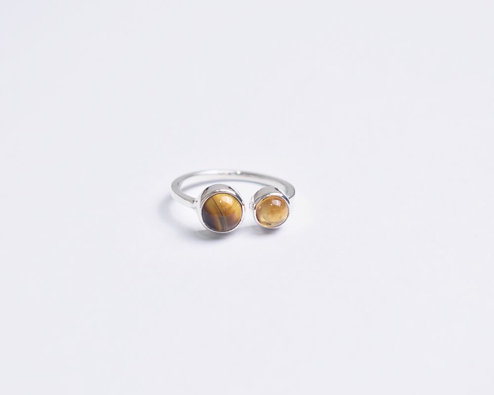 虎の目を連想させる力強い模様のタイガーアイと、ブランデーのような深みのあるオレンジ色が上品な輝きを放つブランデーシトリンを組み合わせたシルバー925のダブルストーンリング。
