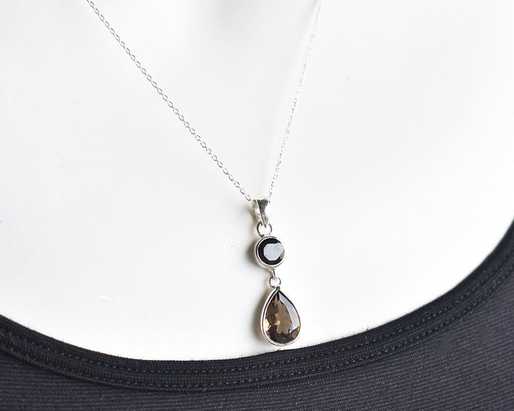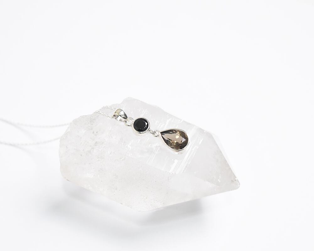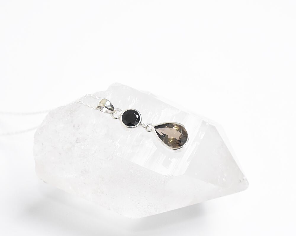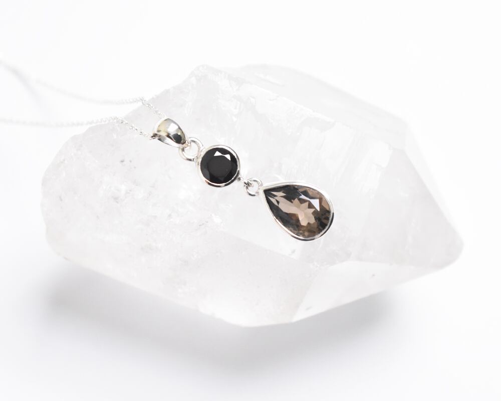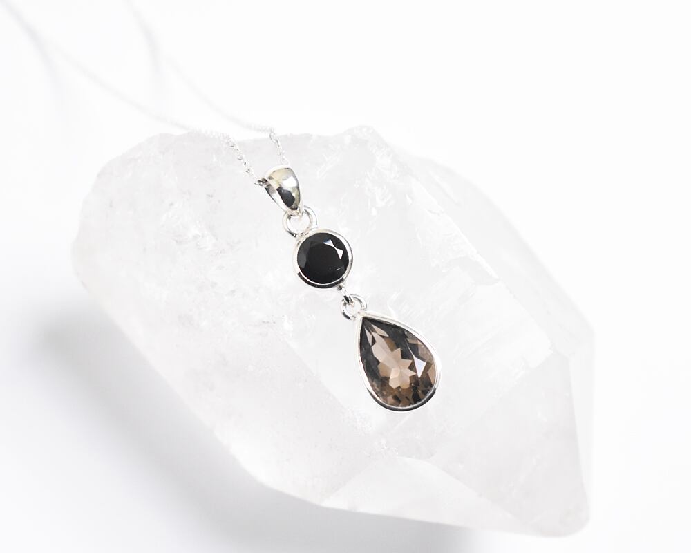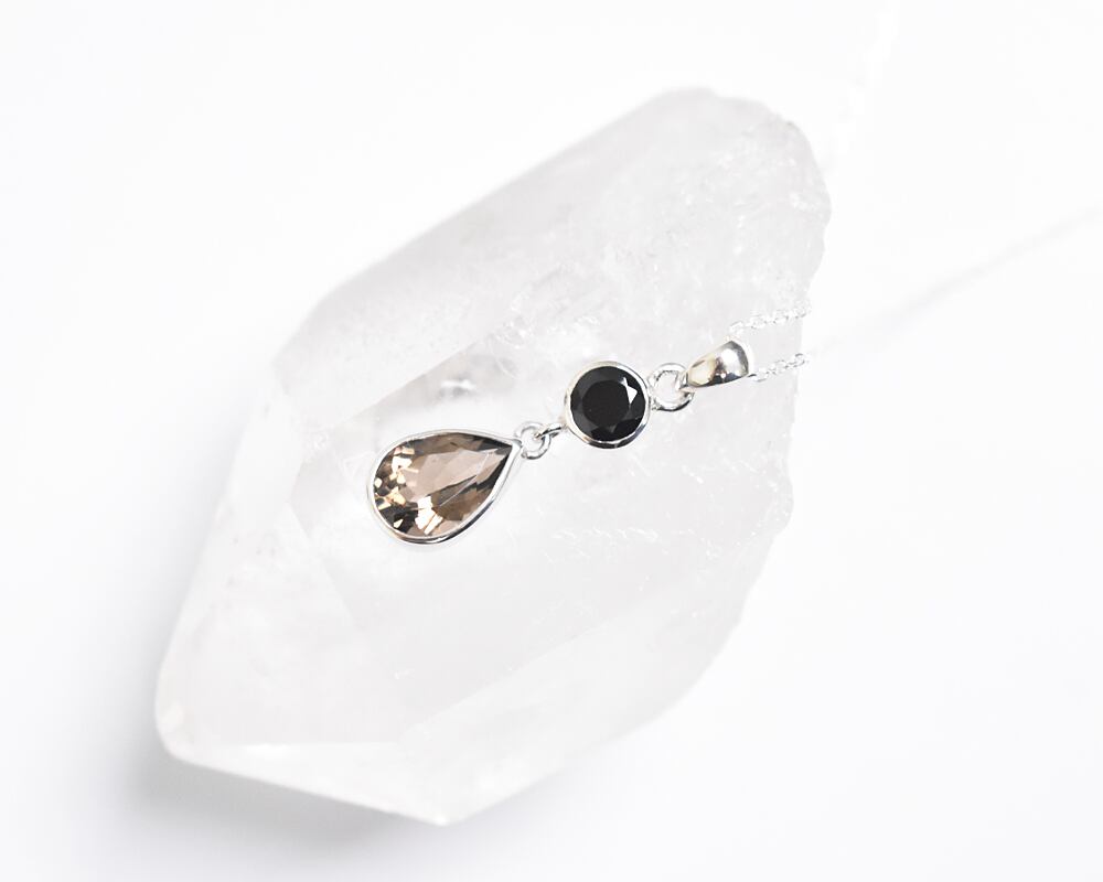 漆黒の輝きを放つ、神秘的な天然石ブラックスピネルと透き通る落ち着いたブラウンカラーがとても上品なスモーキークォーツのシルバーネックレスです。