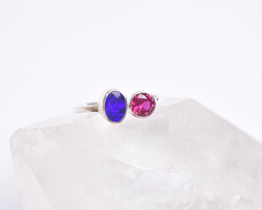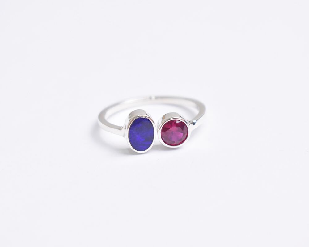 エレガントな輝きを放つ、オパールとルビーのダブルストーンシルバーリング。