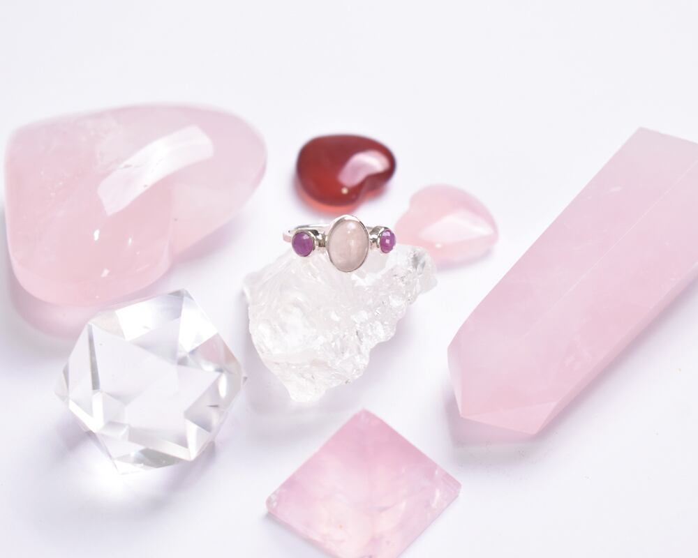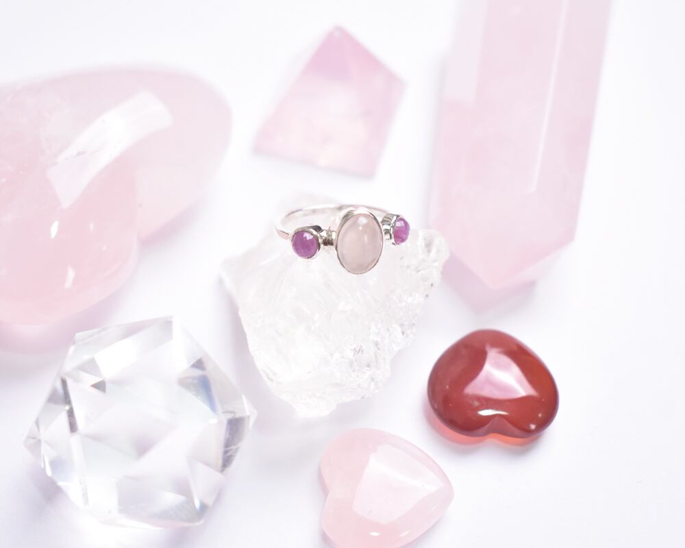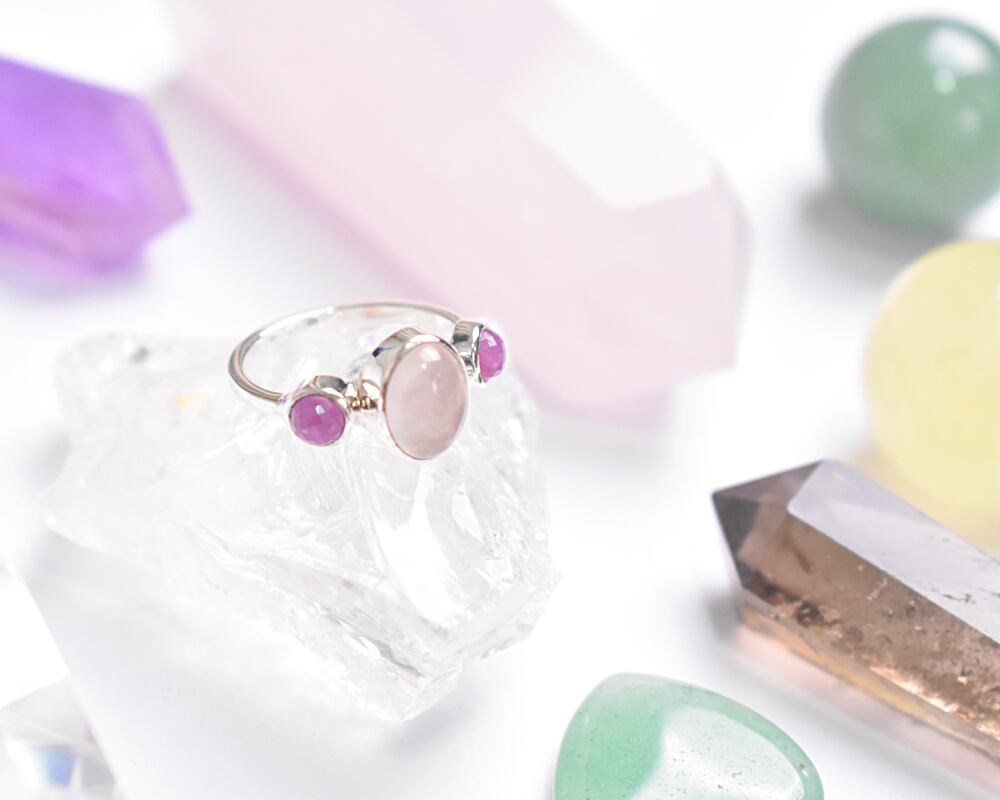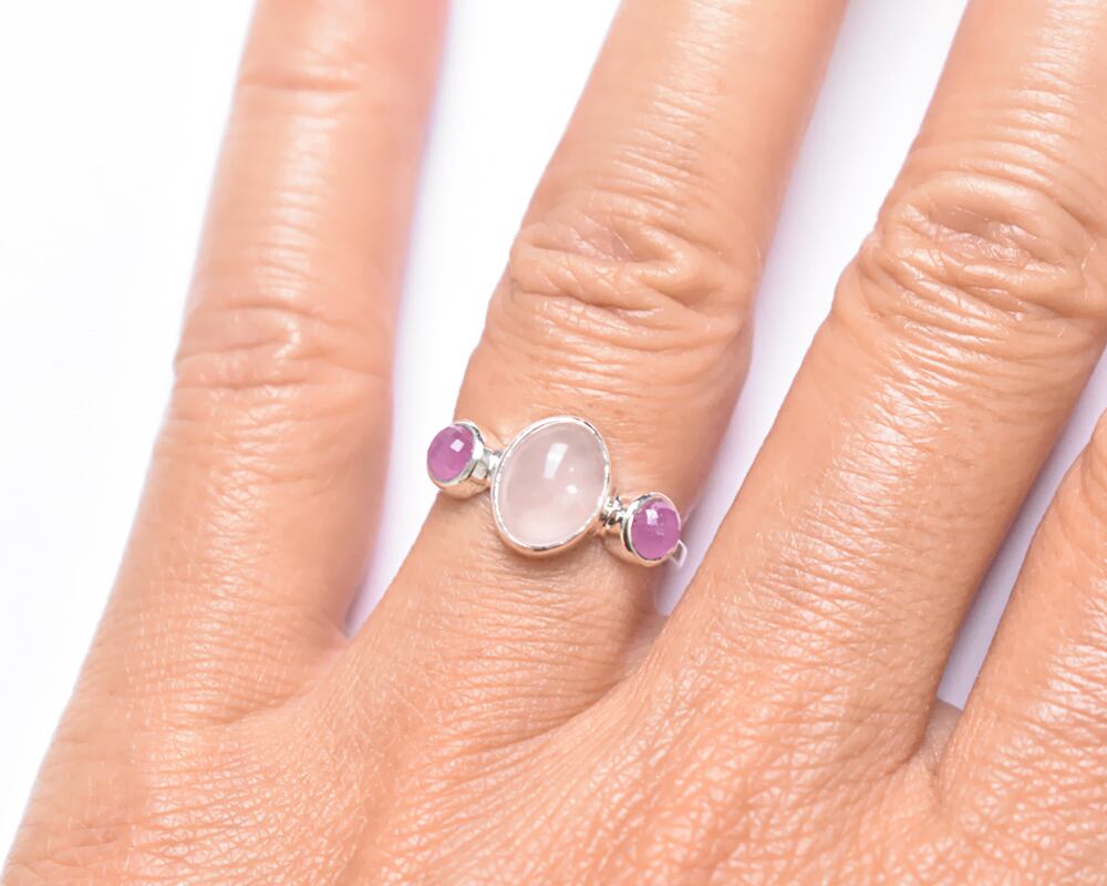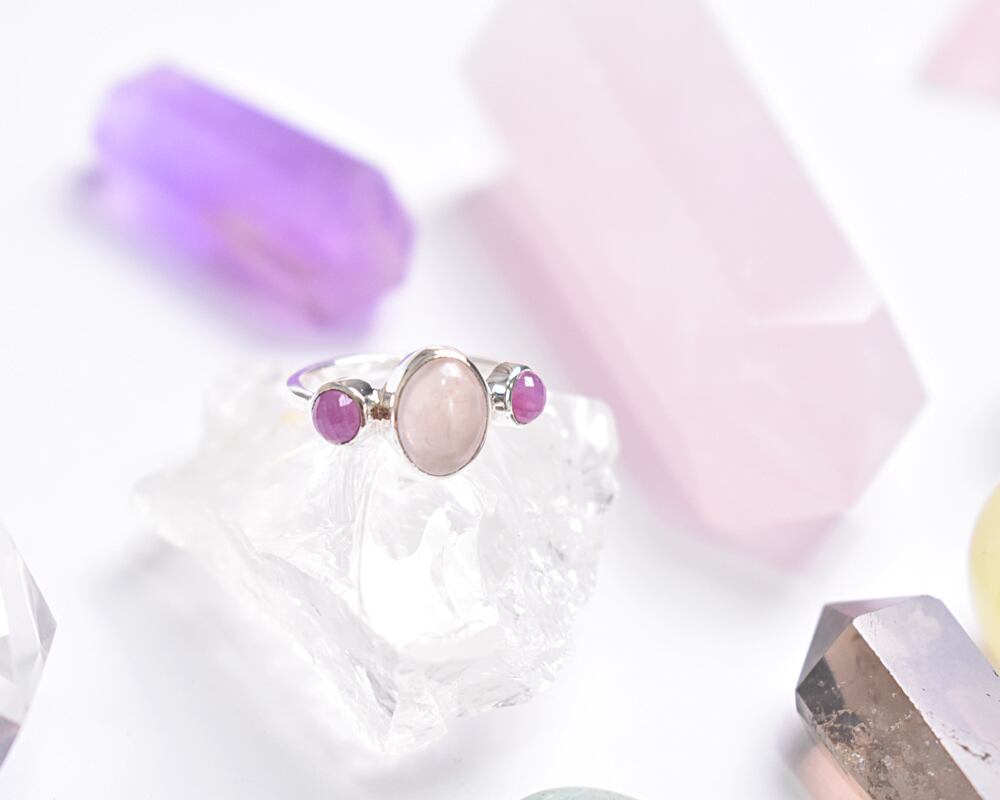 淡いピンク色のローズクォーツと、華やかなピンク色の非加熱のピンクサファイアAAAを組み合わせた、優しい雰囲気漂うシルバーリングです。