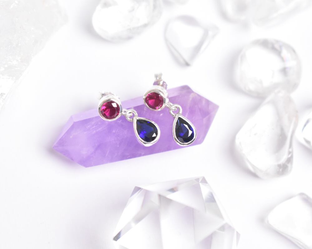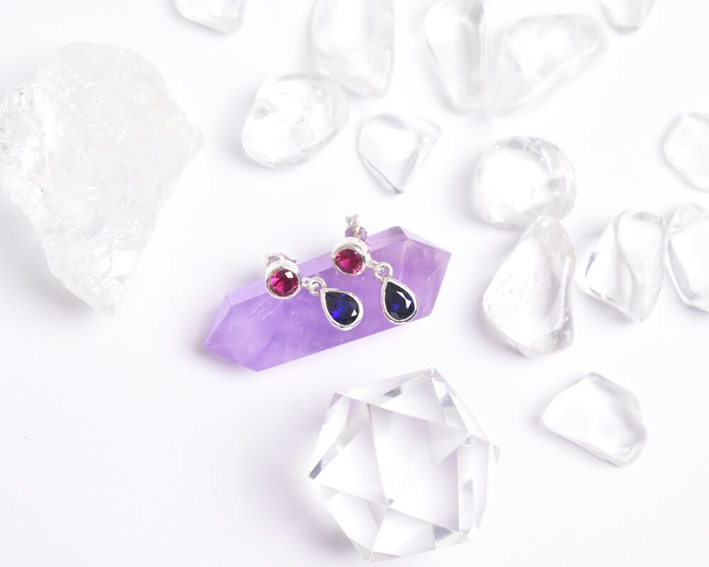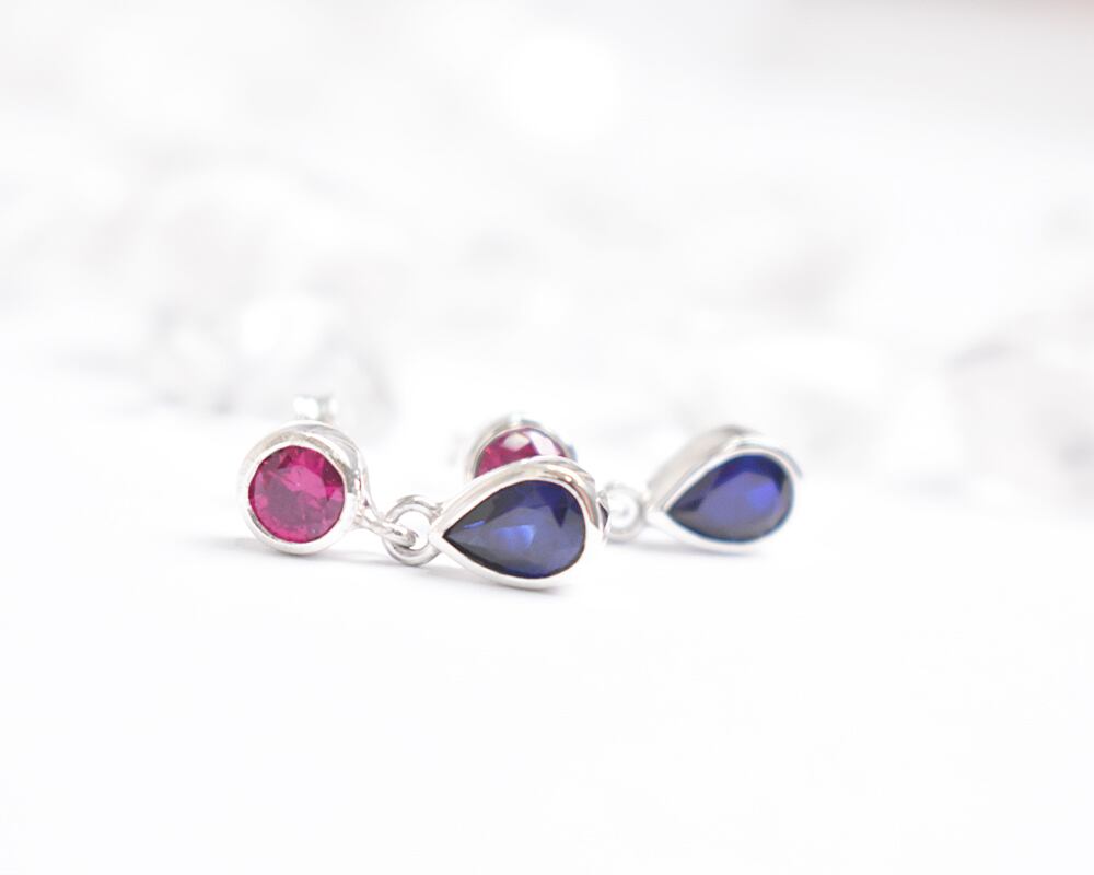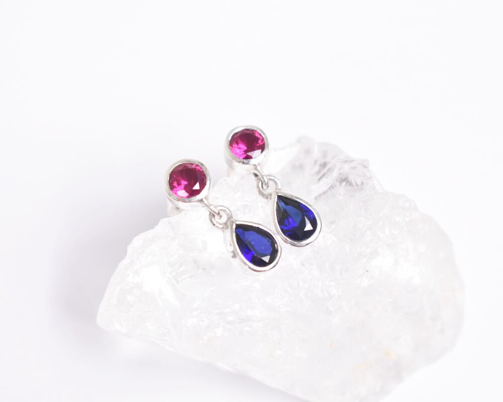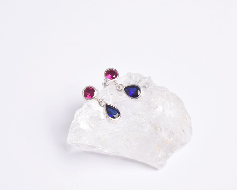 澄んだ青色のサファイアと鮮やかなピンク色のルビーのシルバーピアスです。