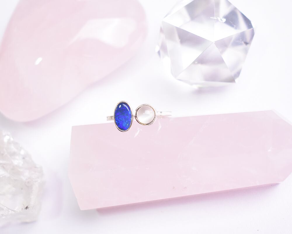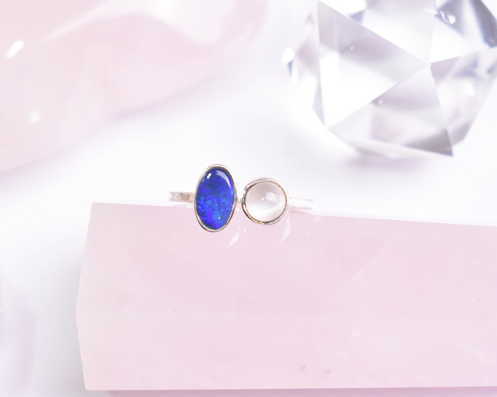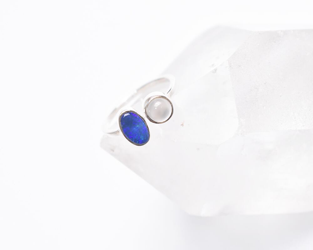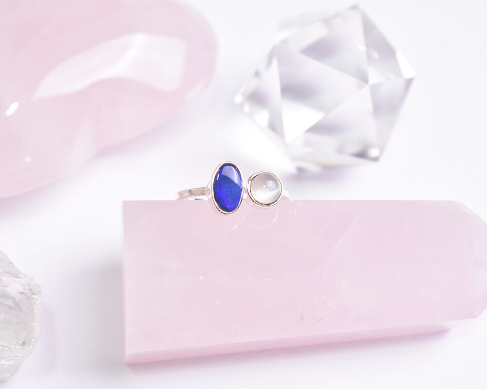 深海の神秘を閉じ込めたような濃い青のオパールと、月の光を宿したようなまんまるのムーンストーンが織りなす、幻想的なフォークリングです。