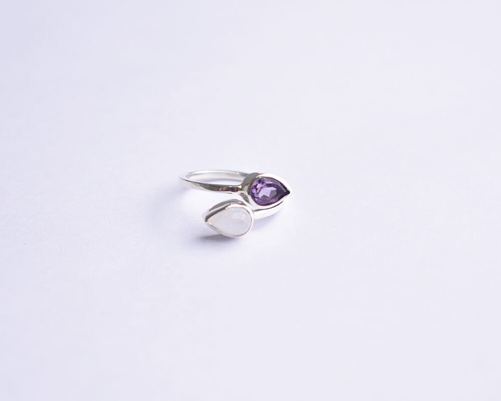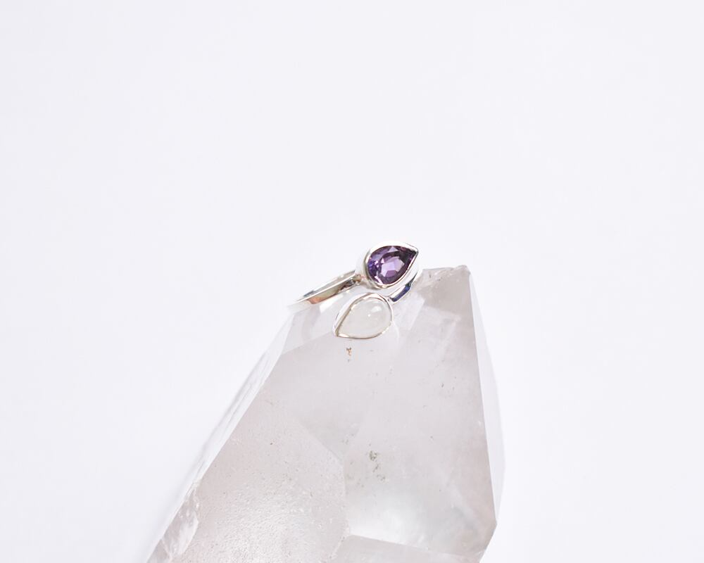透明な紫色のアメシストと幻想的なレインボームーンストーンが織りなす、神秘的なダブルストーンシルバーリング。