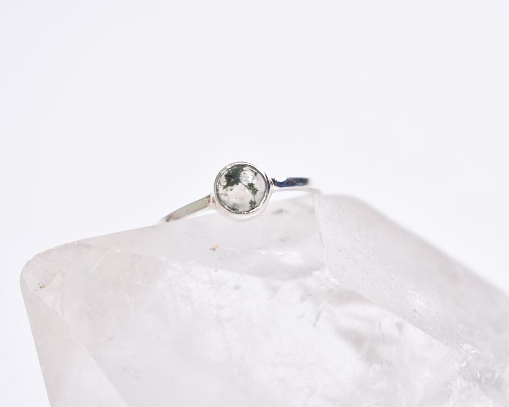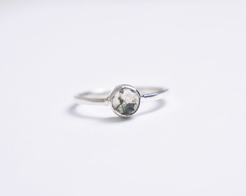 モスアゲートの繊細な模様が指先を美しく彩ります。