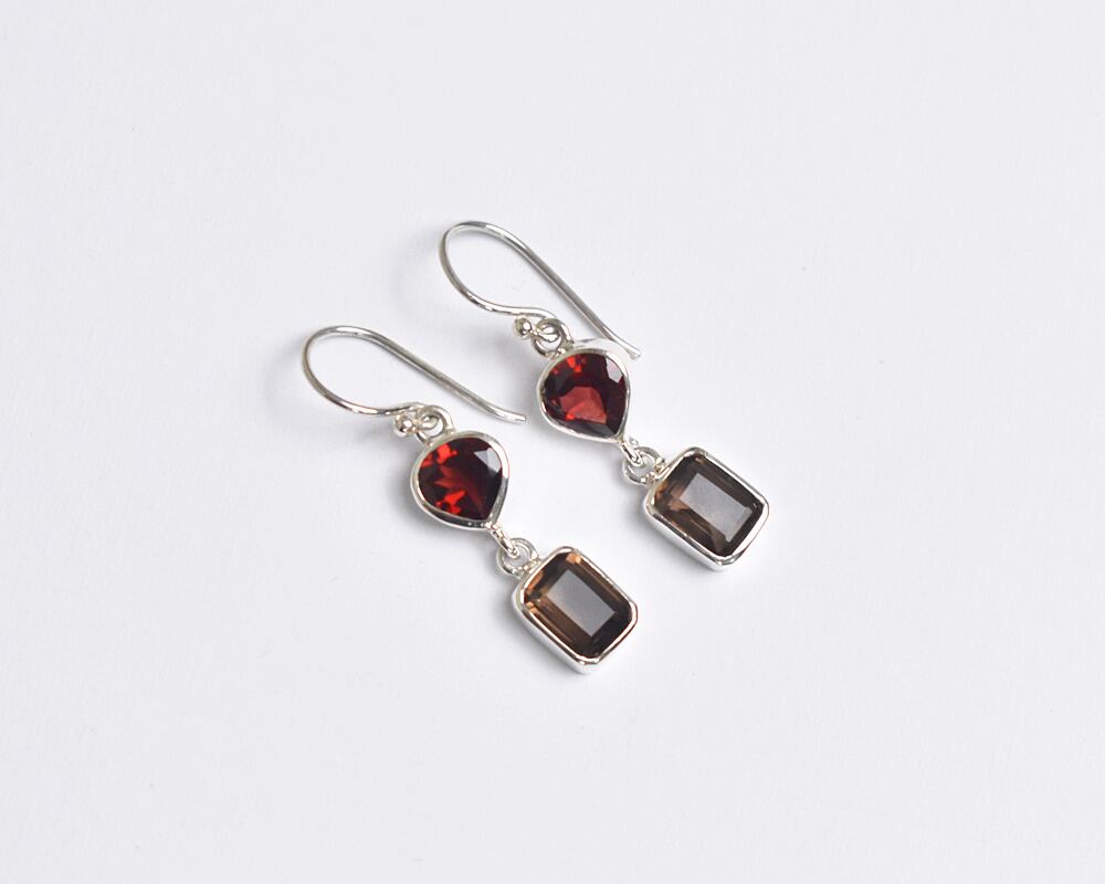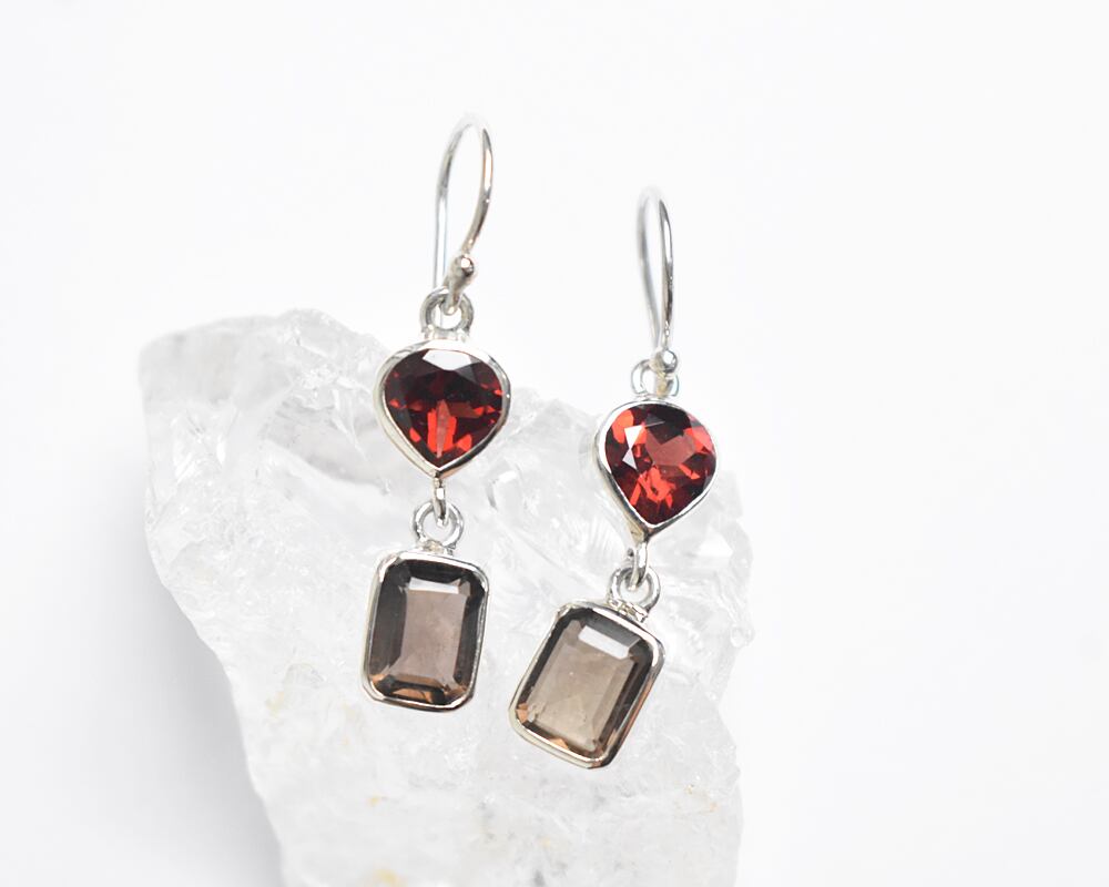 洗練された長方形のスモーキークォーツと煌めくガーネットを組み合わせたシンプルながらも存在感のあるデザインのシルバーピアス。