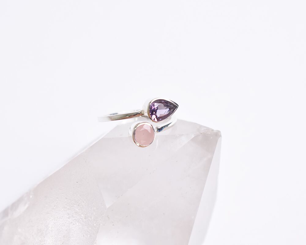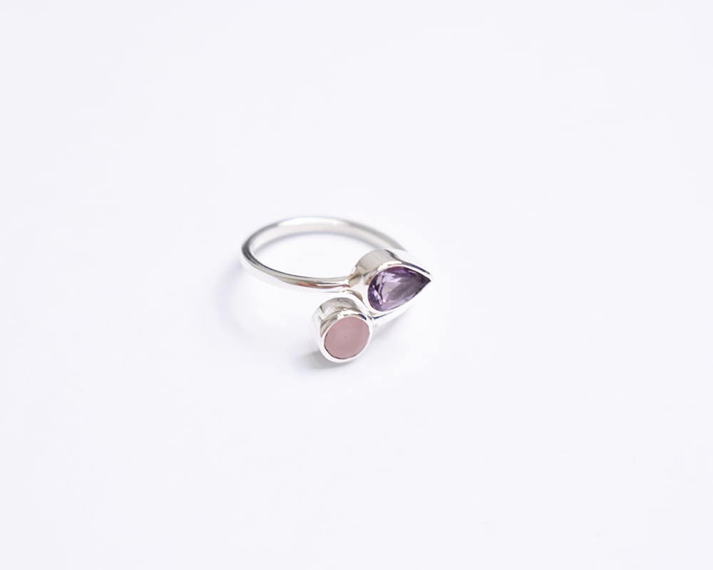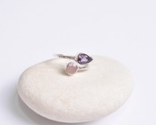 愛らしいピンクが特徴のグァバクォーツと心の安らぎをもたらす紫色のアメジストを組み合わせたシルバーリングです。