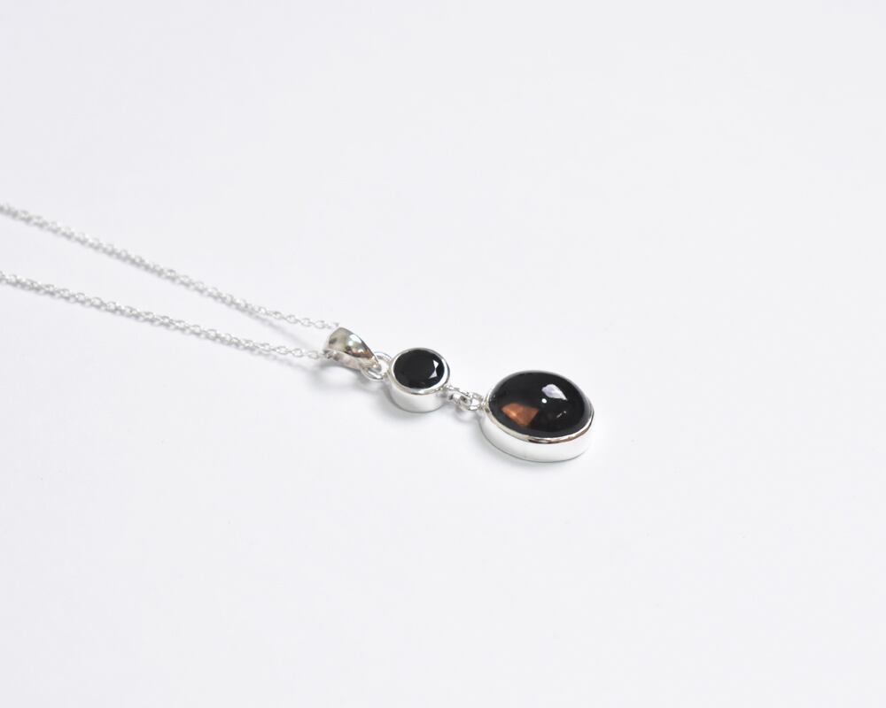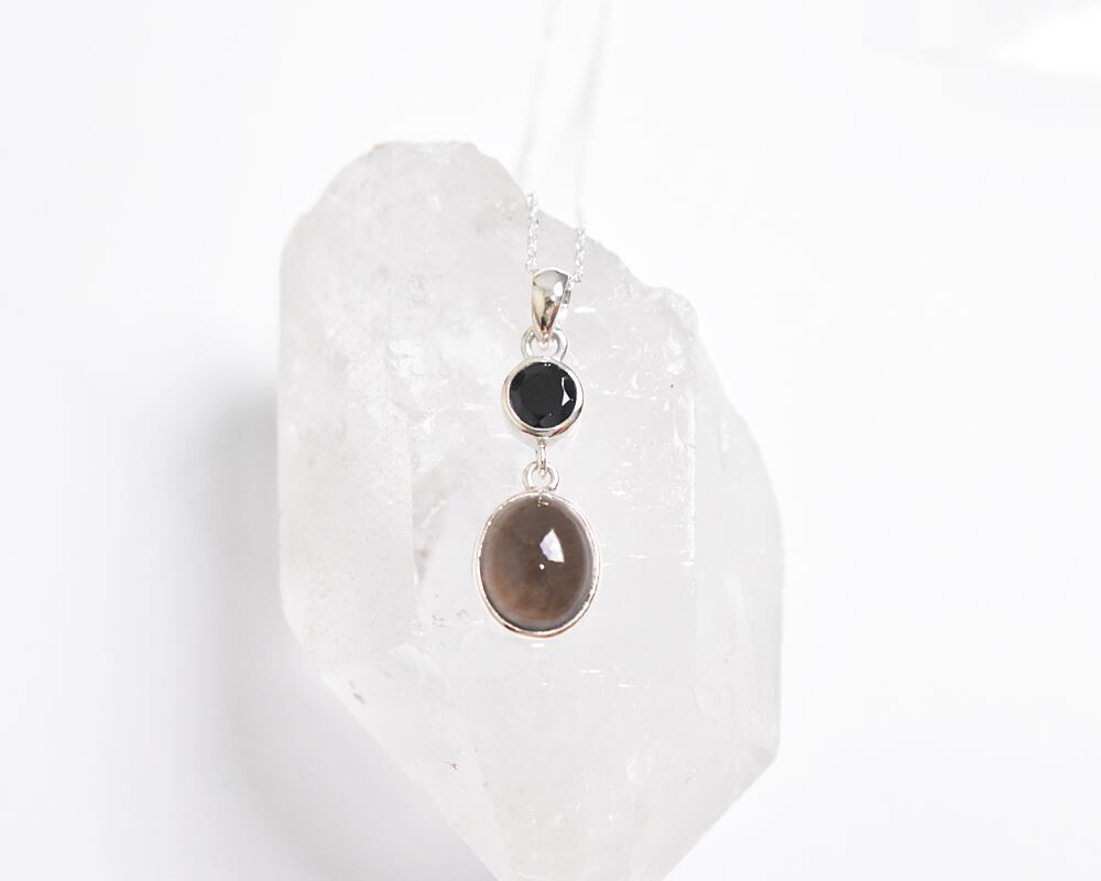 漆黒の輝きを放つ天然石ブラックスピネルと透き通る落ち着いたブラウンカラーがとても上品なスモーキークォーツのシルバーネックレスです。