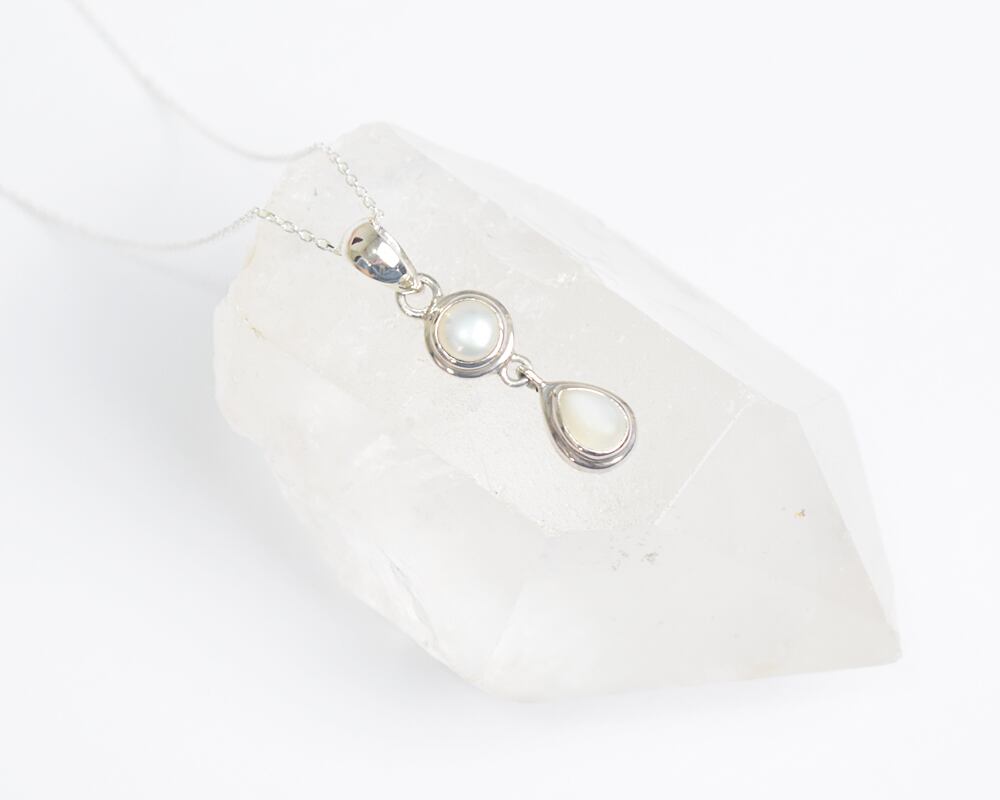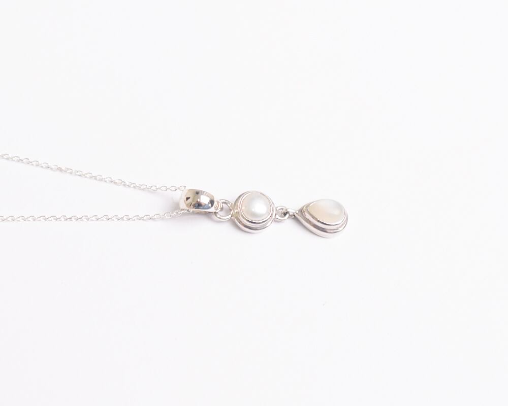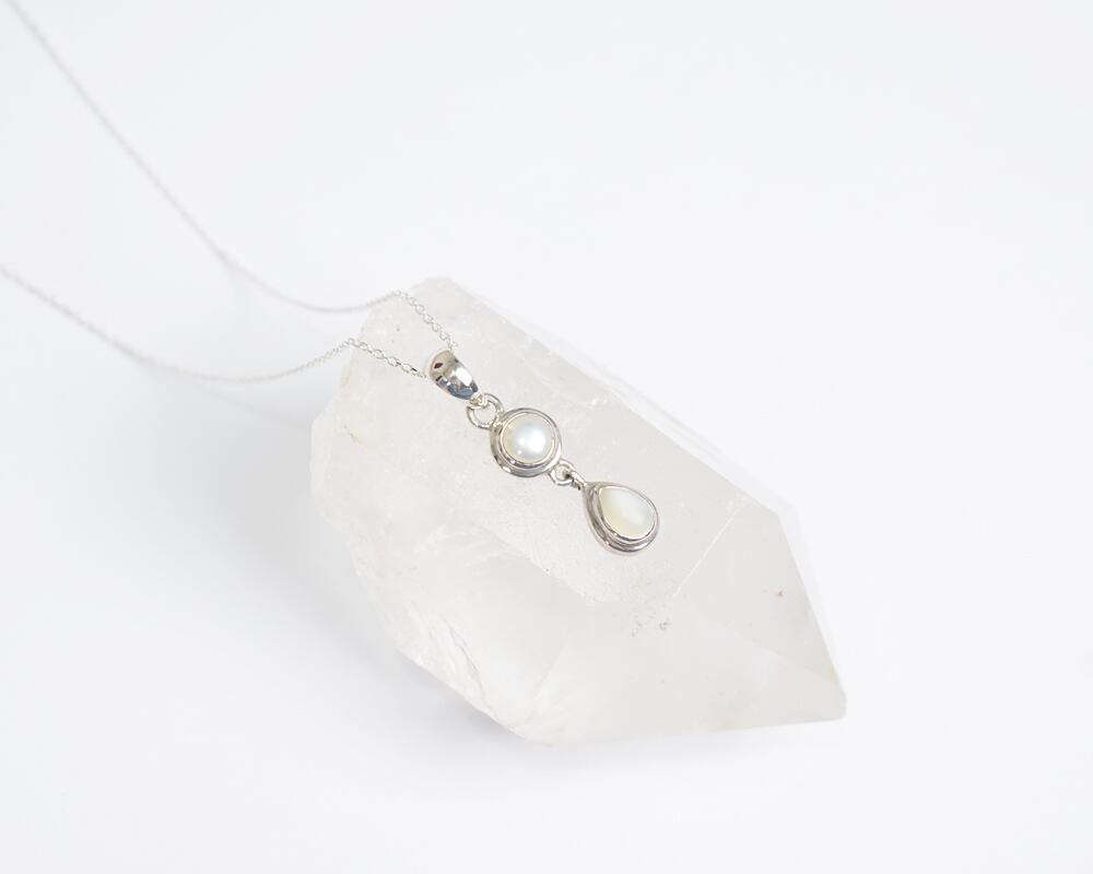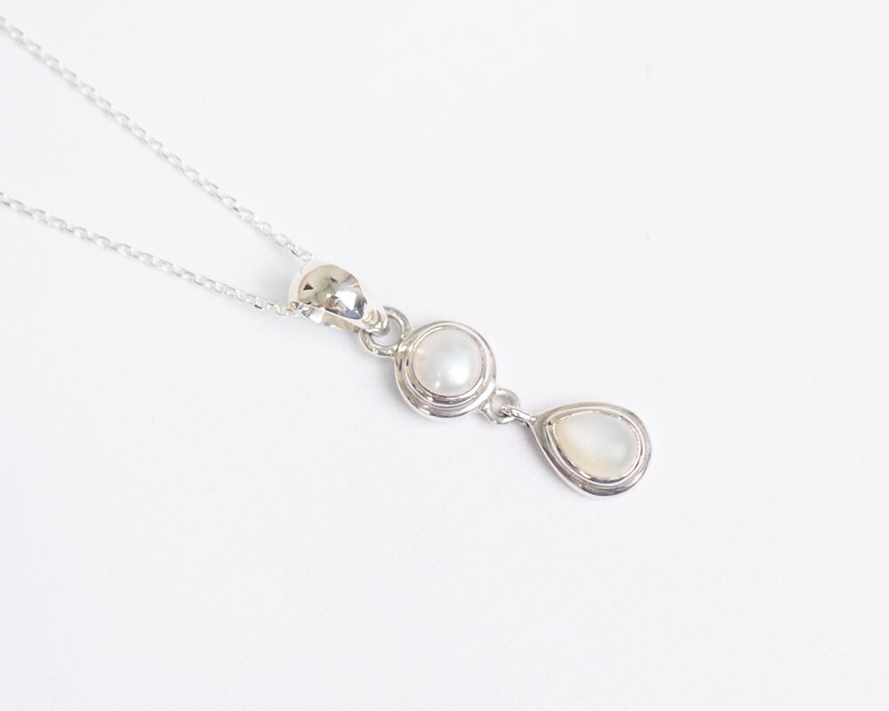 月の光を閉じ込めたような、神秘的な輝きを放つムーンストーンと、優しい光沢を放つ淡水パールのシルバー925ネックレス。