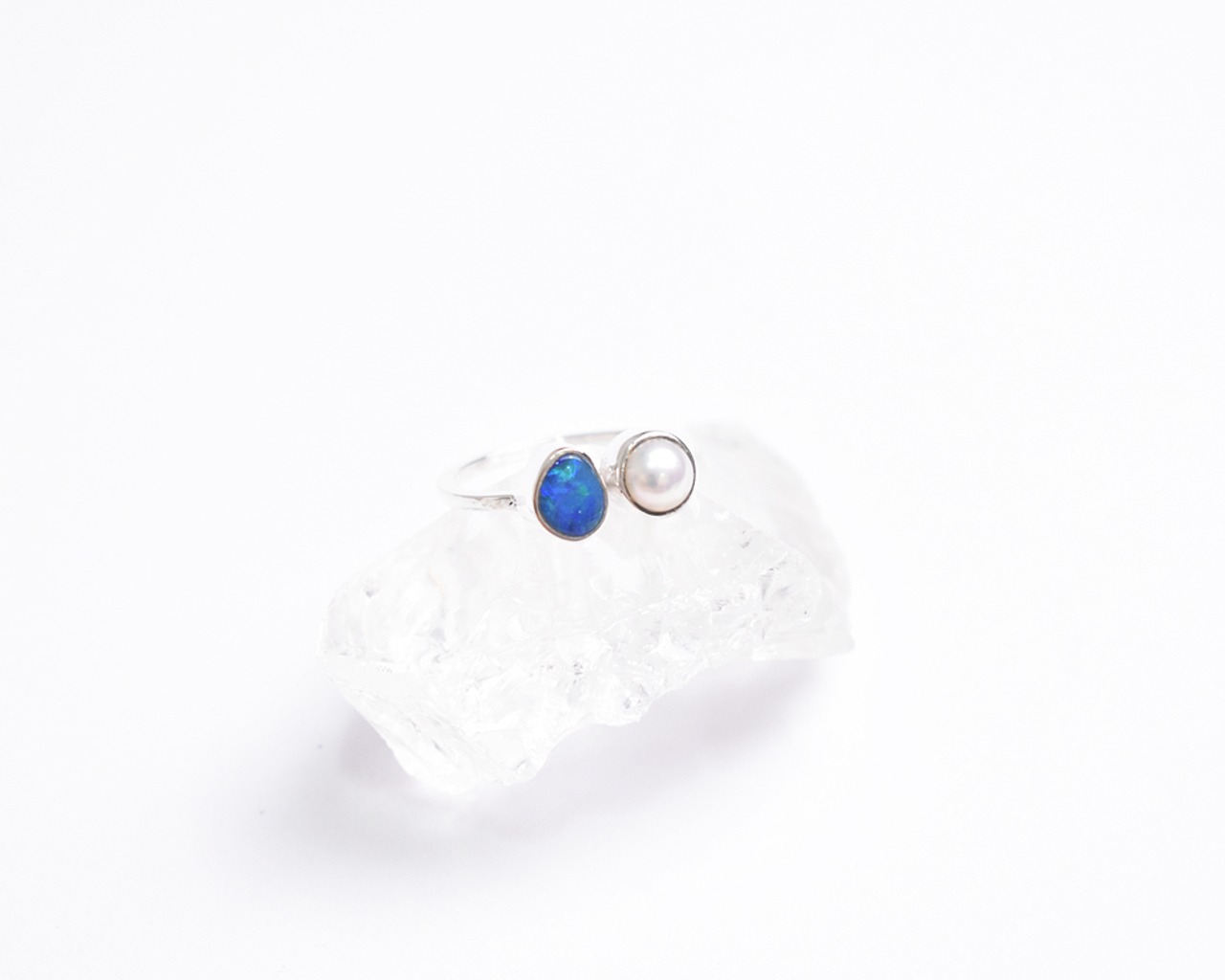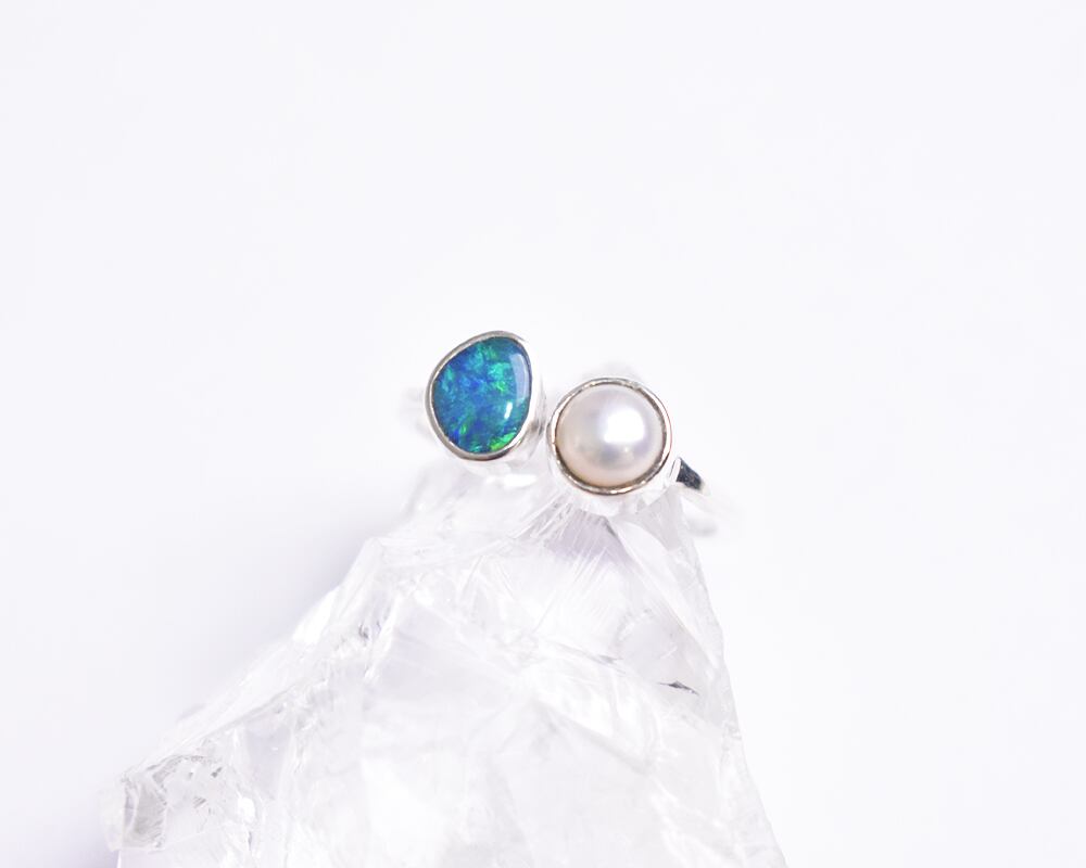 オパールの華やかな輝きを、丸い淡水パールが優しく包み込みます。