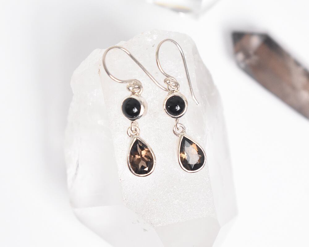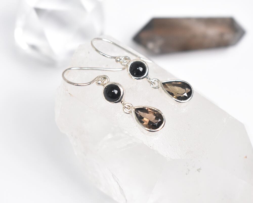 深みのあるスモーキークォーツのドロップ型と、光沢が美しい丸いオニキスの組み合わせが洗練された印象を与える、大人の女性のためのシルバーピアスです。