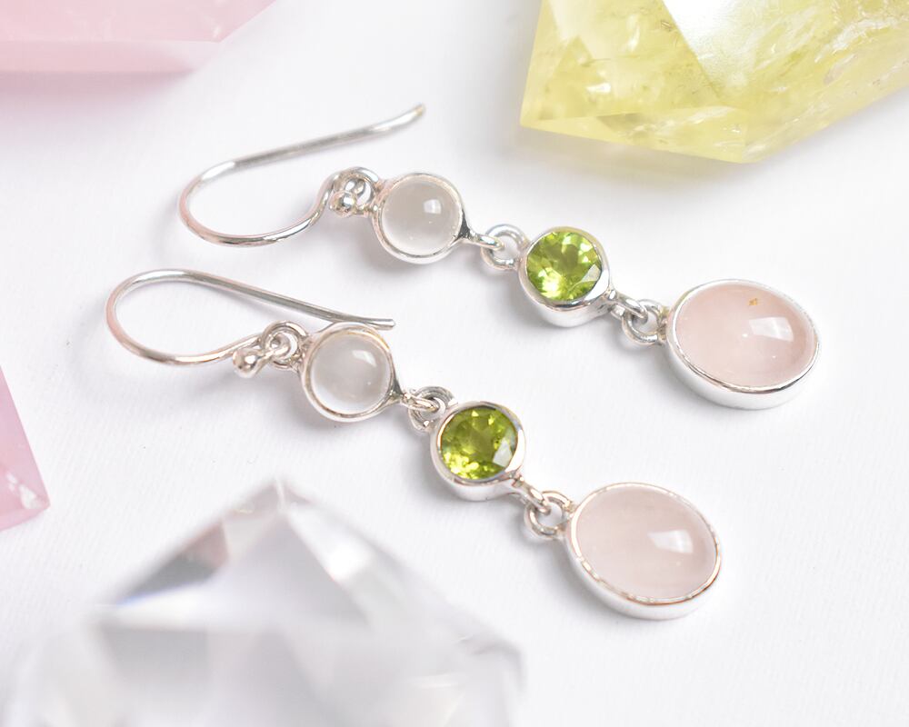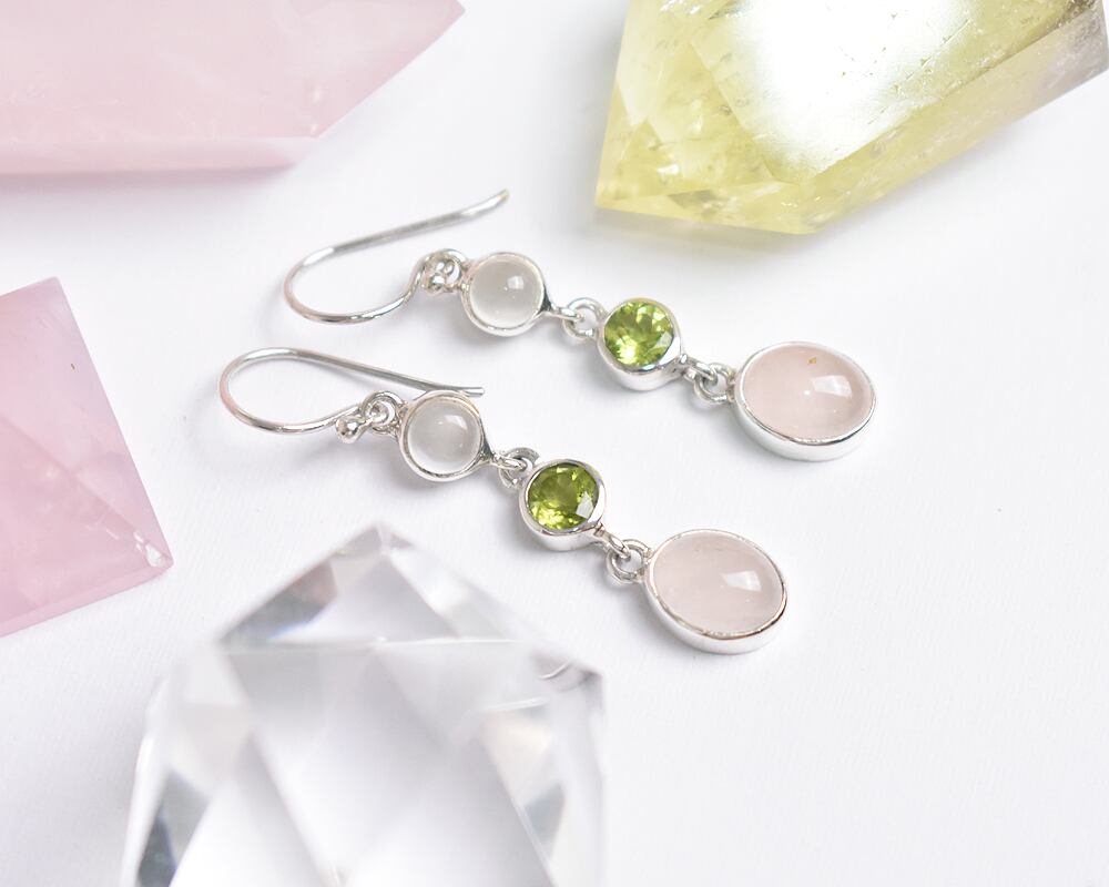 ペリドットの鮮やかな黄緑色と、優しいペールピンクのローズクォ―ツ、乳白色のムーンストーンの優しい輝きは、見ているだけでも心に安らぎを与えてくれるようです。