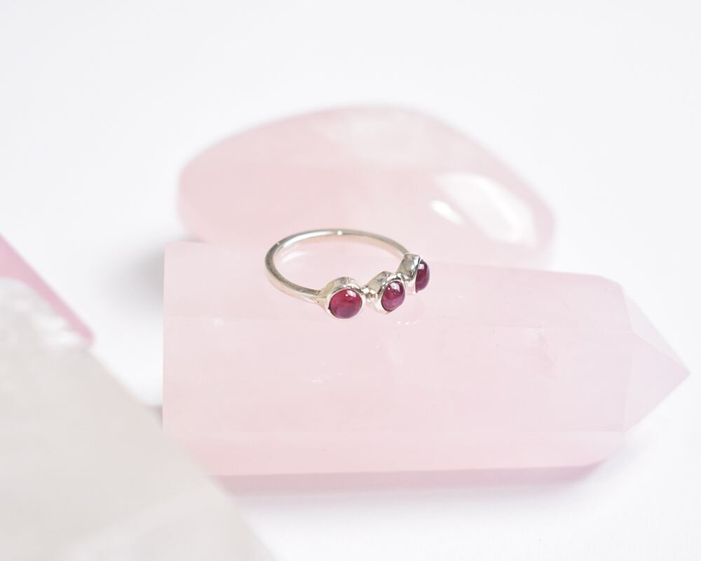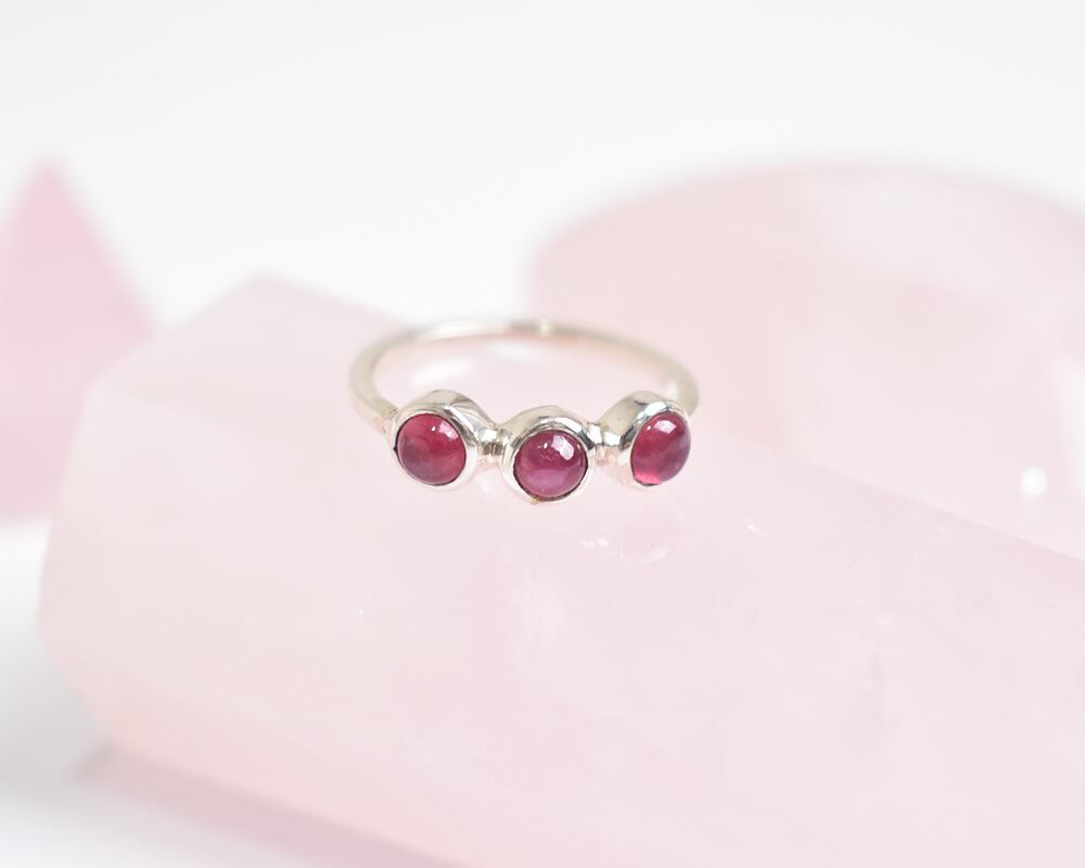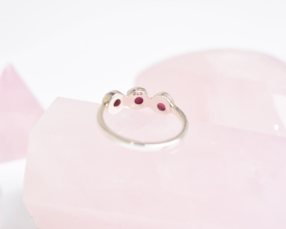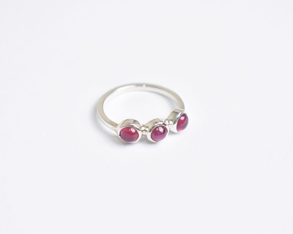 3つのルビーが繊細に並んだ上品なデザインで、シルバーの光沢がルビーの輝きを引き立てます。