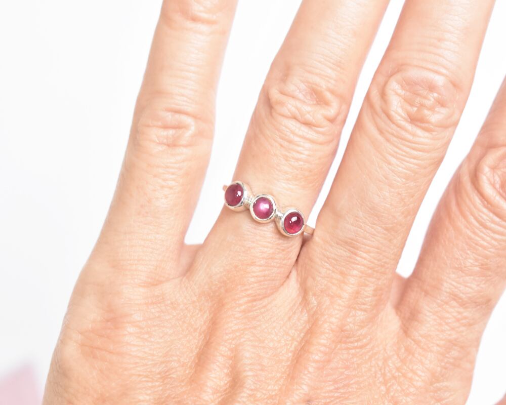 高品質なモザンビーク産のルビーを3つ使用した、ラグジュアリーなシルバーリングです。