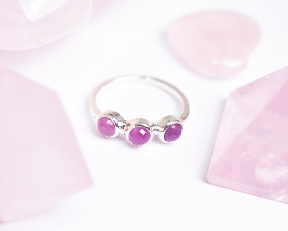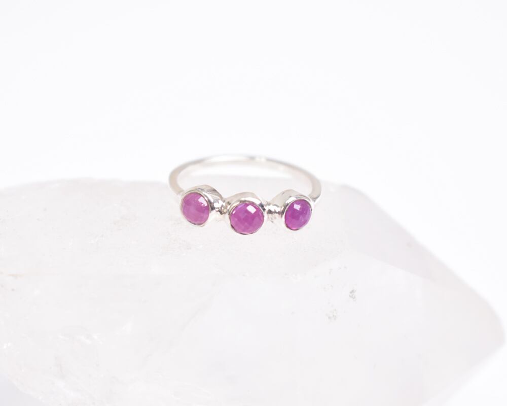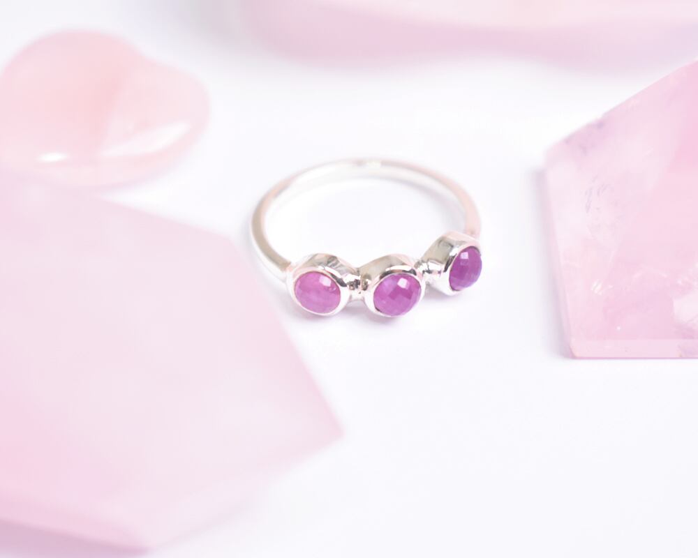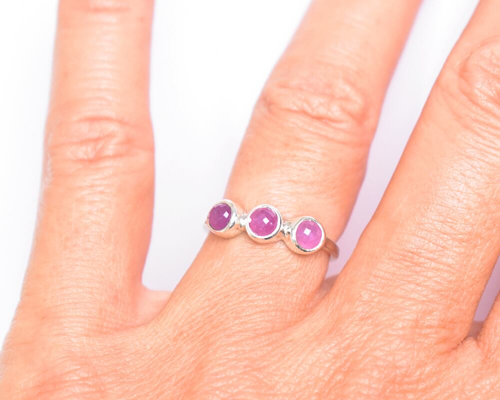 深みのあるピンク色が美しい、非加熱の天然ピンクサファイアを3つ使用したシルバーリングです。