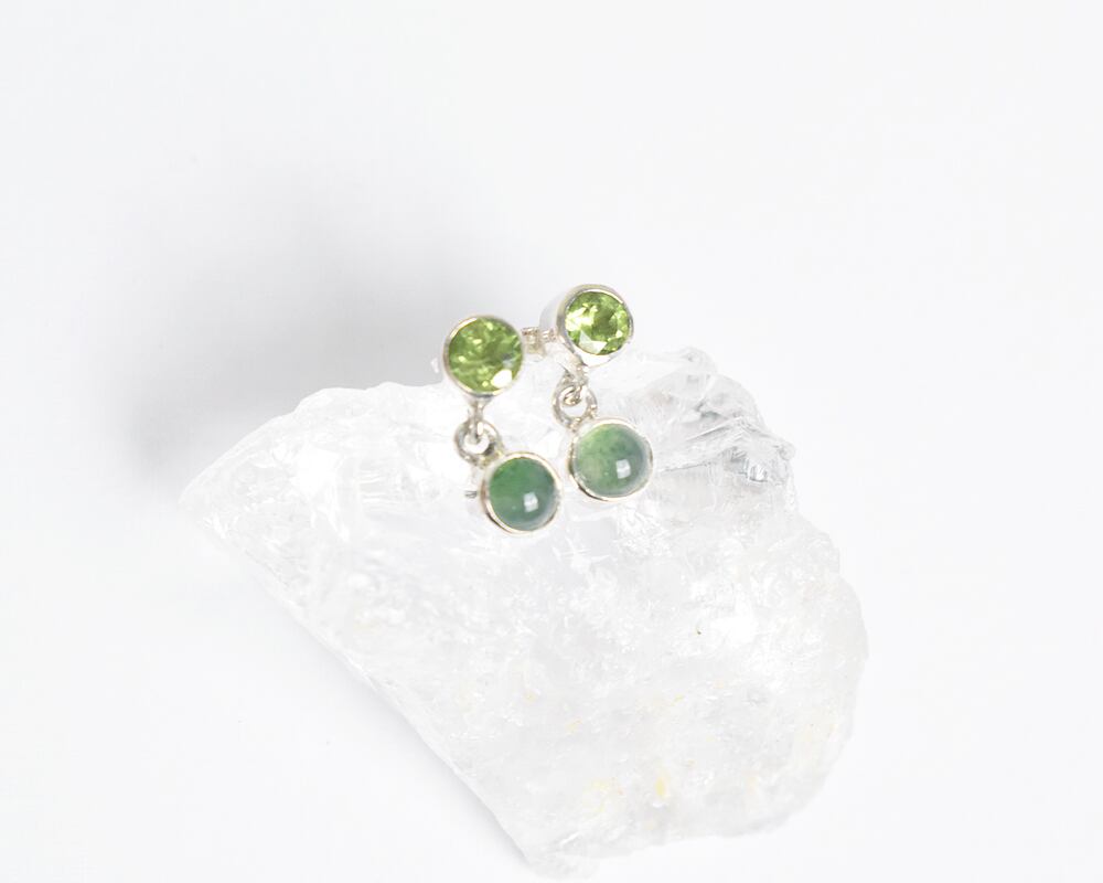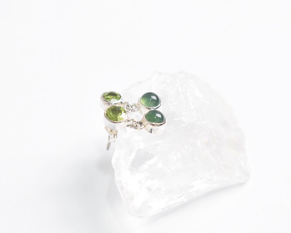 グリーン系のピアスを作りたいと思っていたので、この深緑のモスアゲートに対照的な明るいグリーンのペリドットを合わせました。