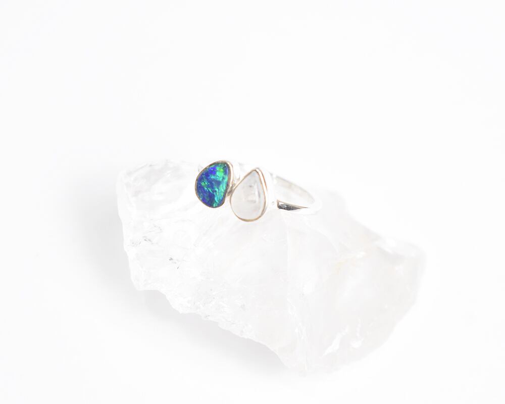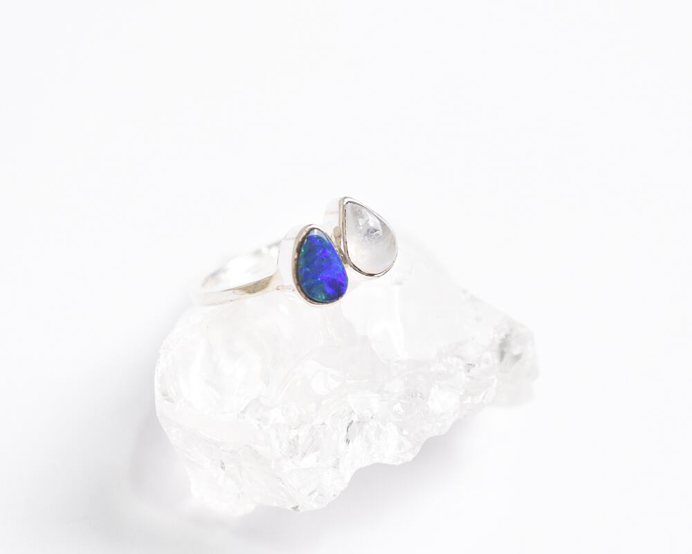 深海の神秘を閉じ込めたような濃い青のオパールと、ドロップ型のレインボームーンストーンが織りなす、幻想的なフォークリングです。